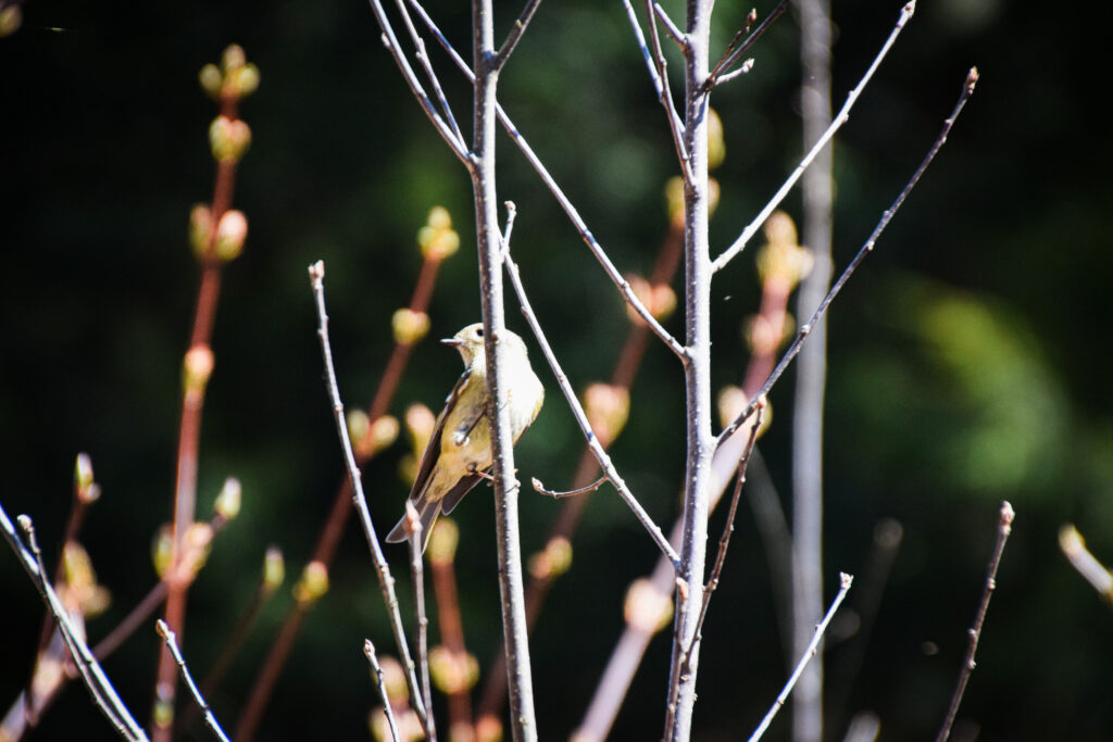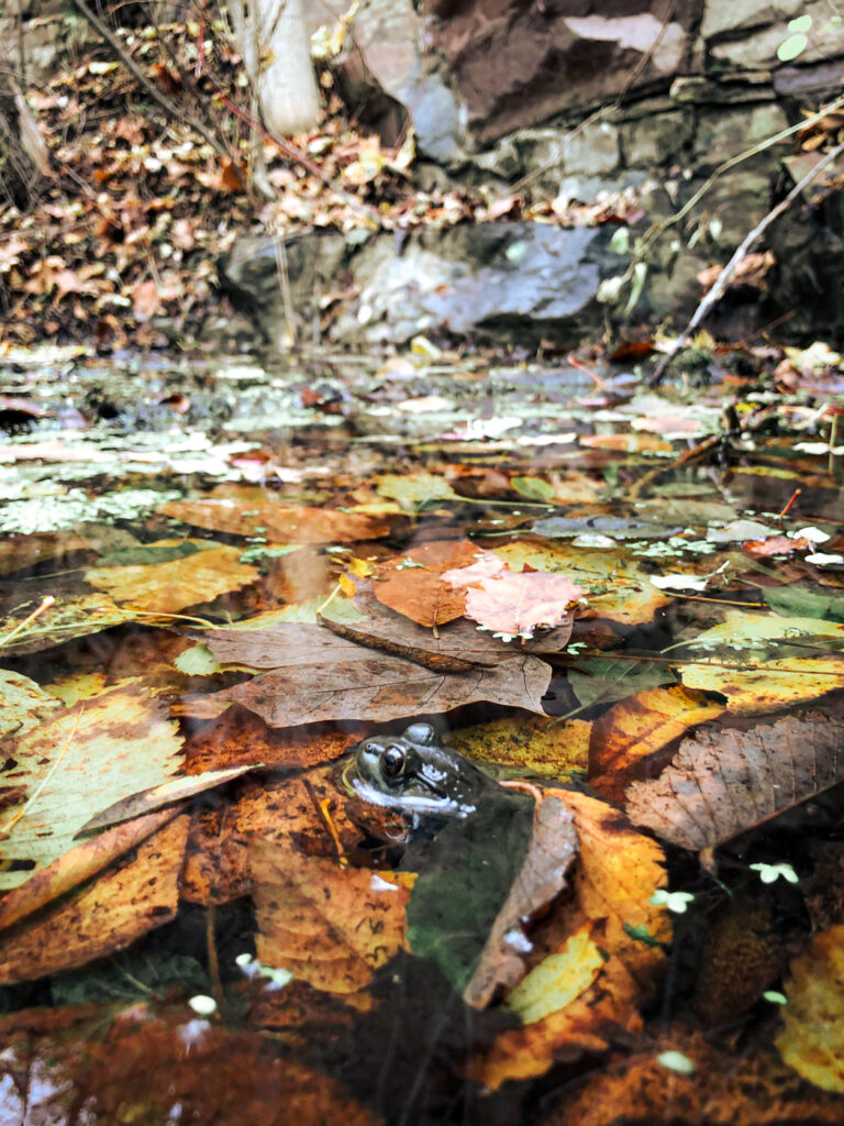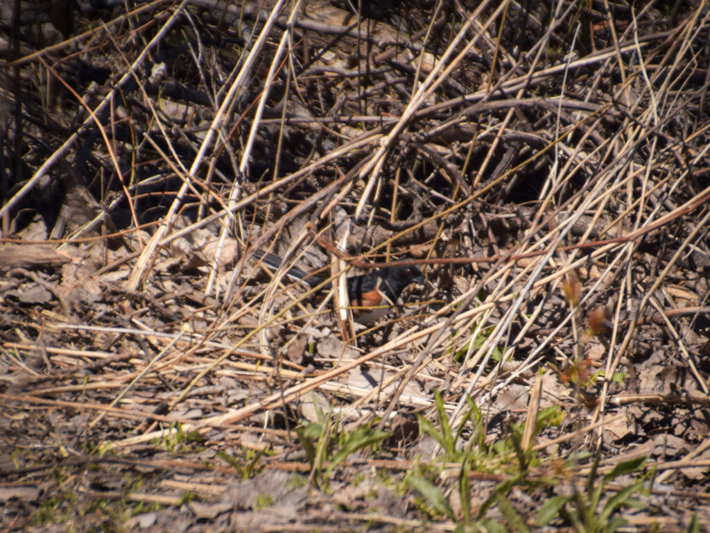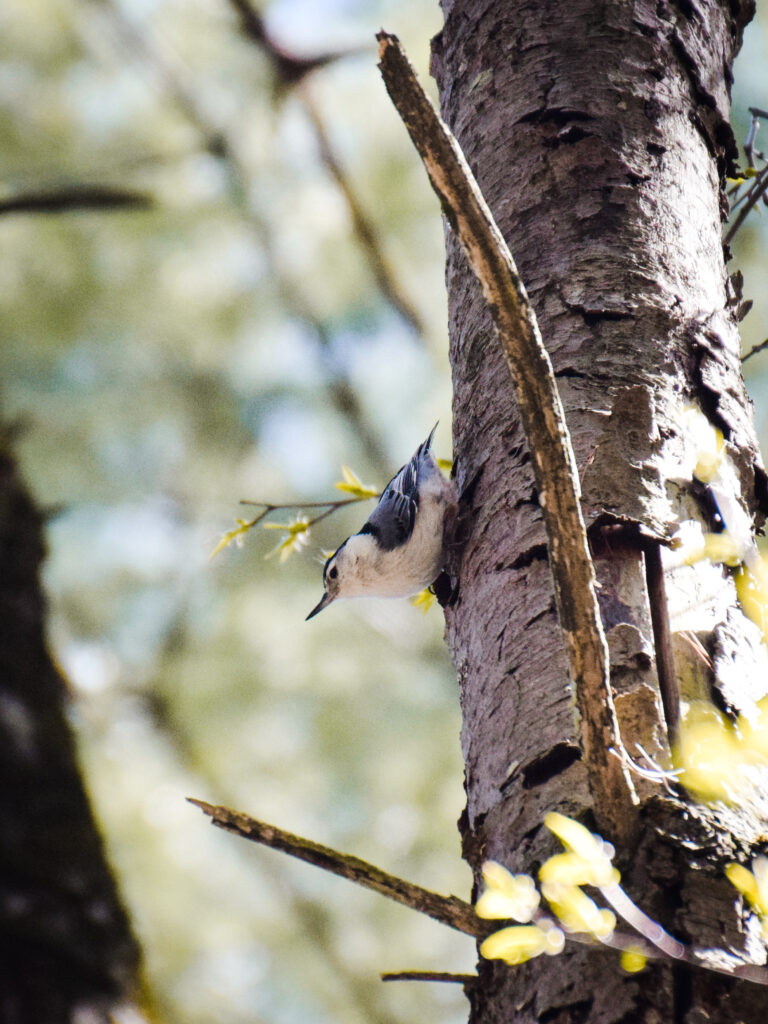 My ears instantly tuned to the sounds of birds in the canopy, which was refreshing given the near silence I’d experienced throughout the winter months. I stopped a few times on my way to the streambed, photographing birds at birdfeeders put up for a bio lab. Aside from the typical birdfeeder crowd, a white-bellied nuthatch swooped down and an elusive eastern towhee scampered out for just long enough to snap a picture.