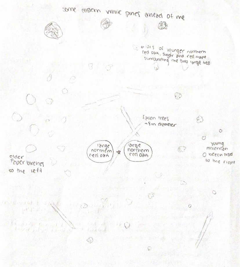 Today I visited Red Rocks Park for the second time to explore its phenology. I sat peacefully in the center of my spot for 15 minutes and took the time to observe my surroundings. There were a few distant birds as well as the rustling leaves of the trees. Most of the noise, though, was made by passing hikers and a group of children who seemed eager to get to the end of the trail. There was a persistent gust of wind that caused some leaves to fall around me. As I spent this time in my spot, I drew a birds-eye map of my surroundings. I recorded the trees I observed that surrounded me and where they are in relation to other species around them.