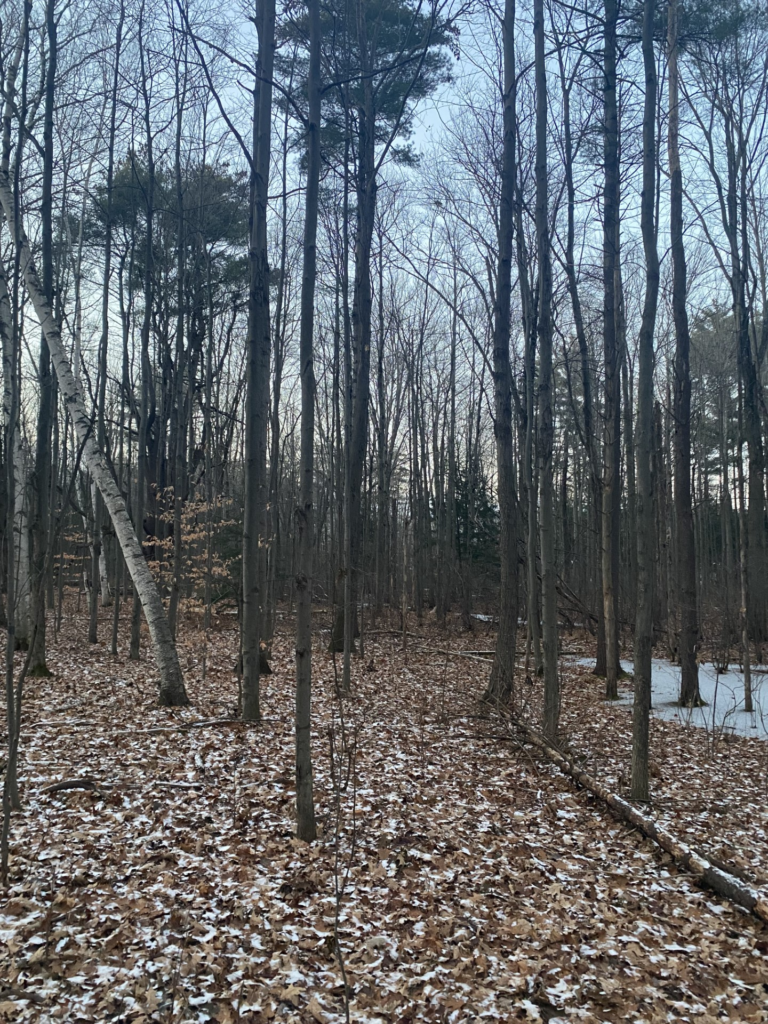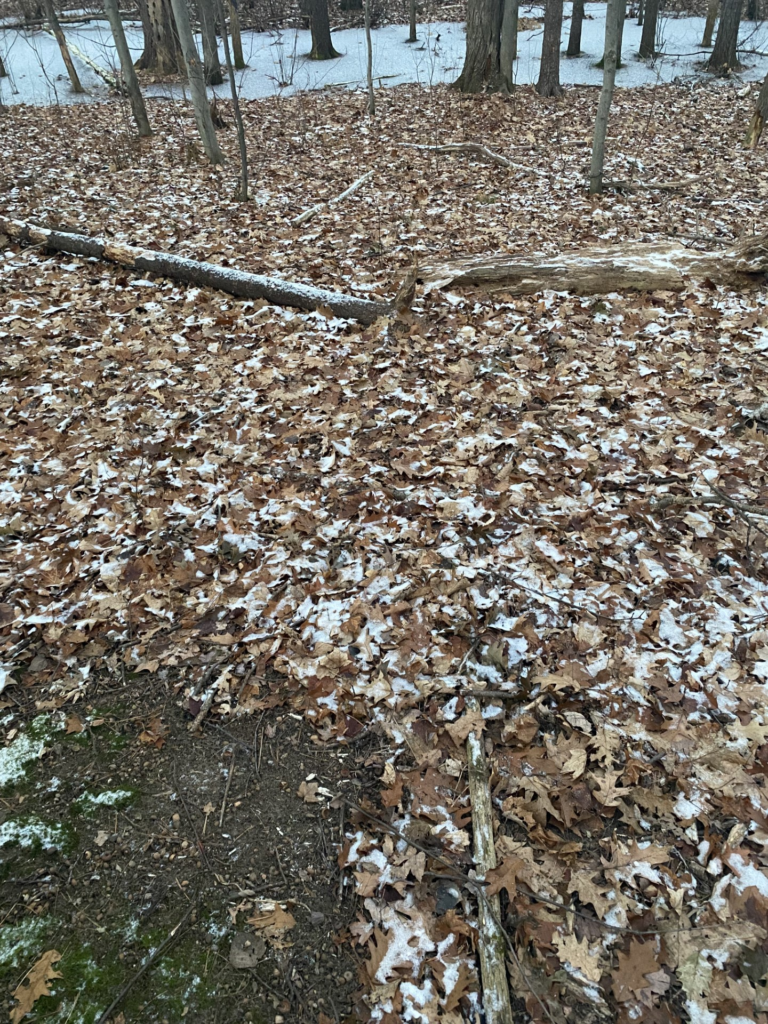 The ground cover has remained consistently thick with leaves, but now the leaves are covered in a light coating of snow. The leaves are all frozen and any previous undergrowth has given into the winter conditions and gone away for the season.