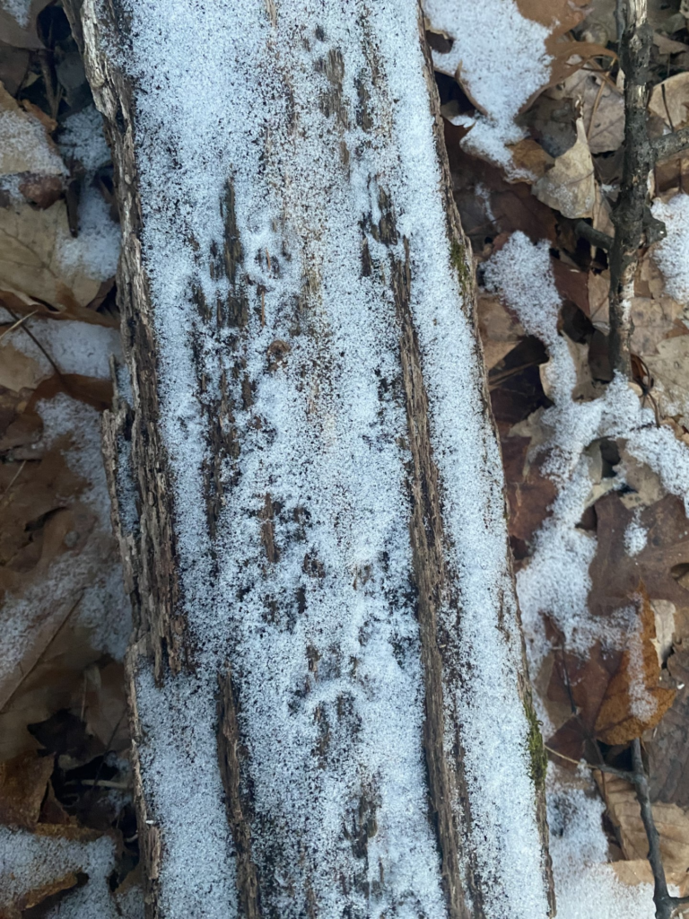 As I sat in my spot recording phenological changes, I observed two squirrels chasing each other on the ice and trees in front of me. I also noticed a snow-covered log lying next to me bearing the tracks of a small animal (pictured to the left). The tracks are a challenge to make out, but I assumed they were left by a squirrel considering the events that were occurring in front of me.