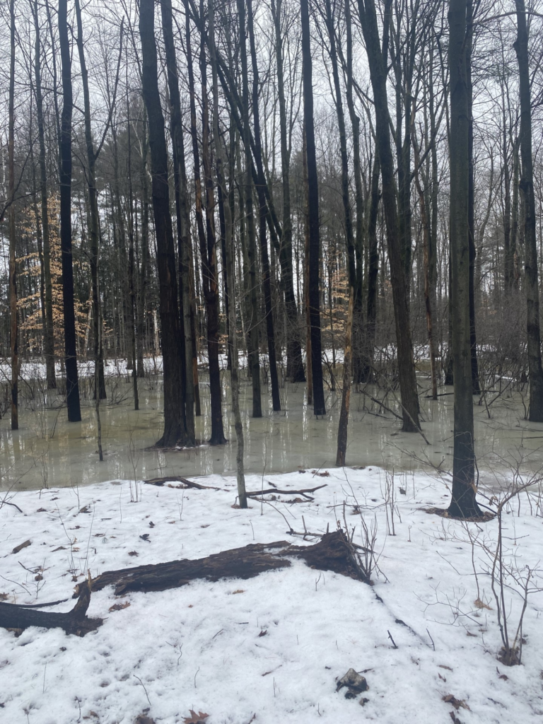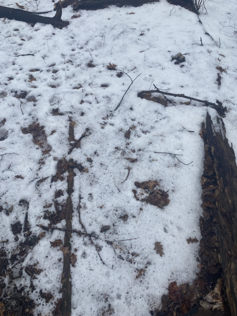 Winter has arrived and its effects are present in my first visit back to my phenology spot this new year. A layer of snow coats the ground and ice covers the path that brings me to my spot. The air has warmed up after a week of frigid temperatures, so I was able to enjoy observing new changes in my spot. I noticed the small pool of water that sat in front of my spot had grown since my last visit 7 weeks ago. Additionally, the ground cover has accumulated more sticks and a layer of wet snow.