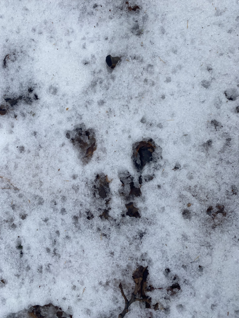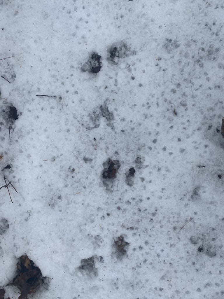 I also saw these wildlife tracks near my phenology spot and guessed them to be tracks of a racoon. The paw marks and spacing share similar characteristics to standard racoon tracks.
