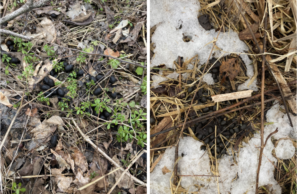 The next day, I set out to explore the depths of Centennial Woods still hoping to find the perfect signs of wildlife. It was only after 10 minutes of walking beyond the path that the first sign appeared. The scat left from a white-tailed deer was present under a layer of twigs and weeds. I questioned if it was rabbit scat, but the amount of it told me it was more likely from a deer than a smaller rabbit. Later, I found an area with some snow yet to be melted away, so I explored it hoping to find tracking marks. While I did not find any prints here, I found even more white-tailed deer scat!