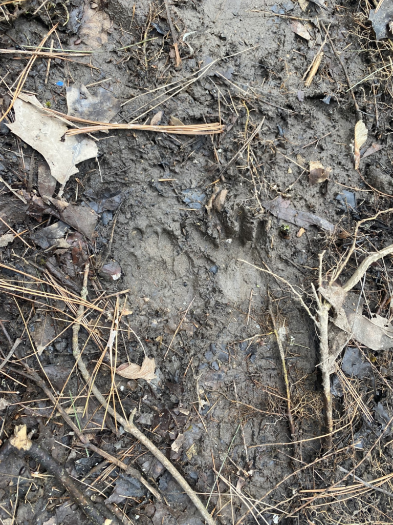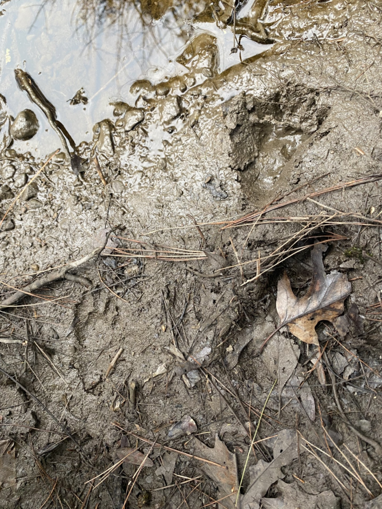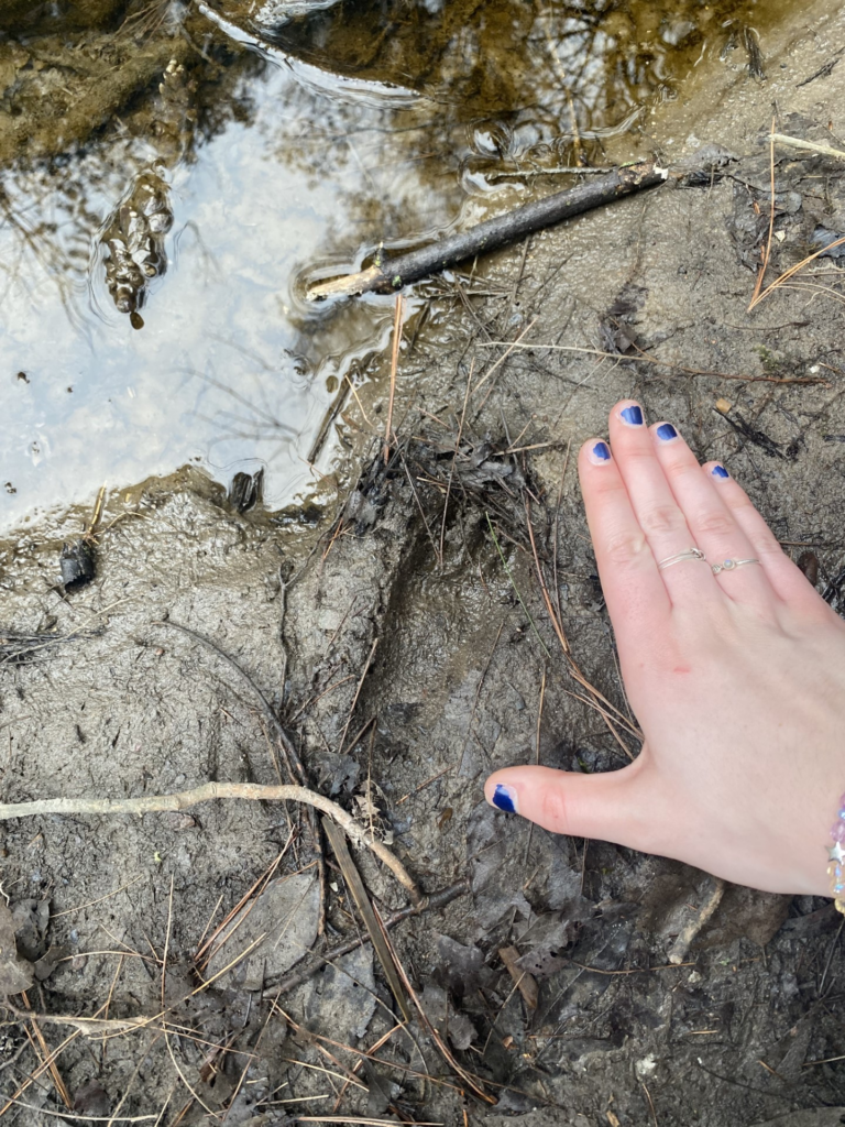 The presence of the white-tailed deer scat gave me the confidence I needed to continue exploring in hopes to find my main goal: wildlife tracks. I found the stream that ran through Centennial Woods and walked along it with the idea that the mud lining of the stream would be the perfect host for the clear, crisp tracks I’d been searching for. I found a small beach of wet dirt that looked like the perfect area to hold tracks, and, upon closer viewing, I proved myself correct. The first thing I found looked like a small, stretched out handprint. Beyond that track I found three more of the same track walking in the direction of the water! I knew this was a racoon due to the five fingers, the way it looked like a hand, and the size of the tracks.