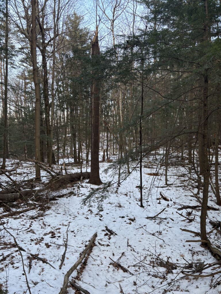 There is now a layer of snow on the ground. There are now far less bird sounds, and while at my spot I didn’t see any woodpeckers, only a single crow flew overhead.