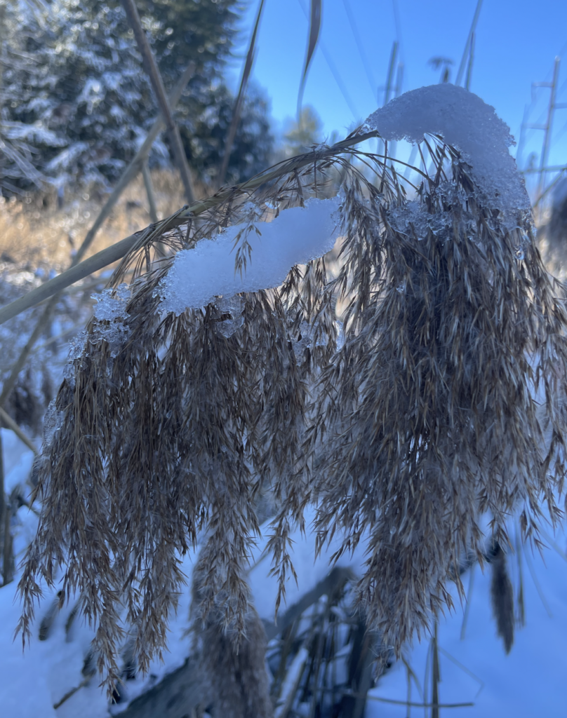 When observing my spot I noticed many phenological changes. Some that stood out to me are the trees and the cattail change. The trees are dead and are covered in snow. Furthermore, the snow has weighted down the cattails which has caused them to die. Although they died, it provides a habitat for invertebrates in the stream. By the time spring is arriving and the snow has melted, they will regrow for the new season.