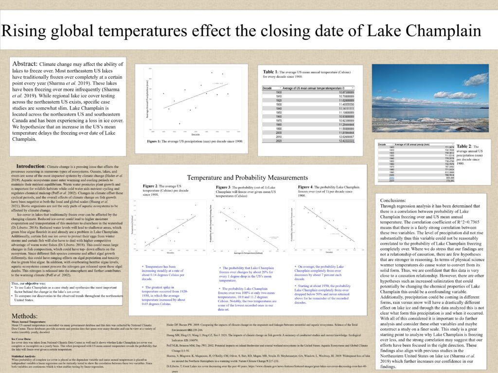 April 30, 2021May 12, 2021 Rising global temperatures effect the closing date of Lake Champlain By cafong Leave a comment on Rising global temperatures effect the closing date of Lake Champlain This poster proposal was created by Spencer Mahne and Colby Fong as part of our Spring 2021 NR 103 Signature Assignment Click here to enlarge the poster.