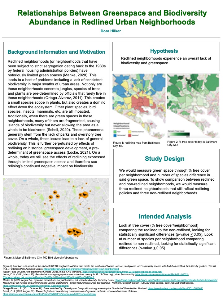 May 2, 2021May 12, 2021 Relationships Between Greenspace and Biodiversity Abundance in Redlined Urban Neighborhoods By dhilker Leave a comment on Relationships Between Greenspace and Biodiversity Abundance in Redlined Urban Neighborhoods Slide1Download This poster proposal was created by Dora Hilker as part of our Spring 2021 NR 103Signature Assignment click here to enlarge