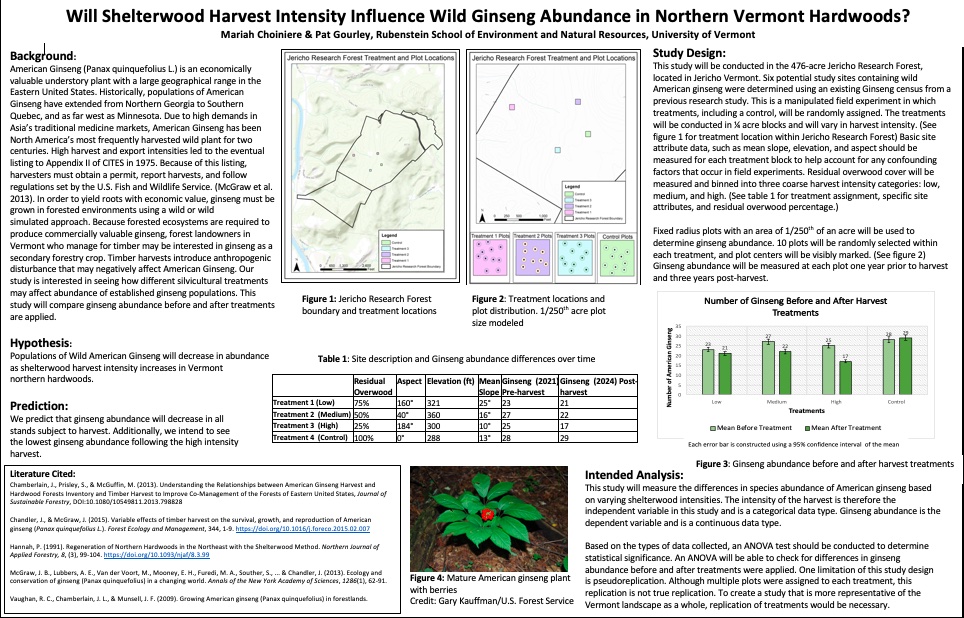 May 2, 2021 Will Shelterwood Harvest Intensity Influence Wild Ginseng Abundance in Northern Vermont Hardwoods? By pgourlay Leave a comment on Will Shelterwood Harvest Intensity Influence Wild Ginseng Abundance in Northern Vermont Hardwoods? This poster proposal was created by Mariah Choiniere & Pat Gourlay as part of our Spring 2021 NR 103 Signature Assignment. Click here to enlarge the poster!
