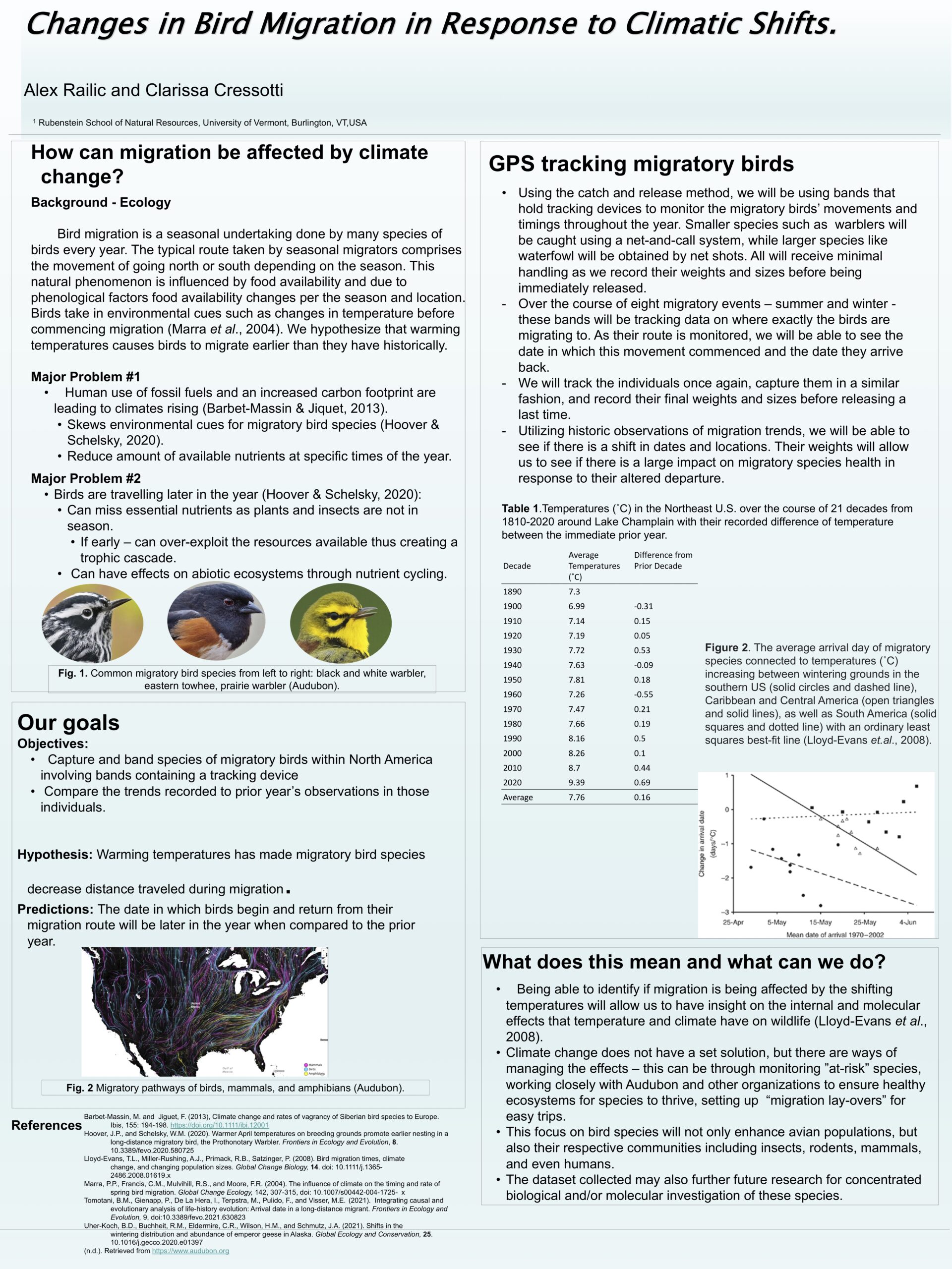 May 5, 2021May 12, 2021 Changes in Bird Migration in Response to Climatic Shifts By ammorale Leave a comment on Changes in Bird Migration in Response to Climatic Shifts This poster proposal was created by Alex Railic and Clarissa Cressotti as part of our Spring 2021 NR 103 Signature Assignment Click here to enlarge the poster! Alex_Railic-1Download