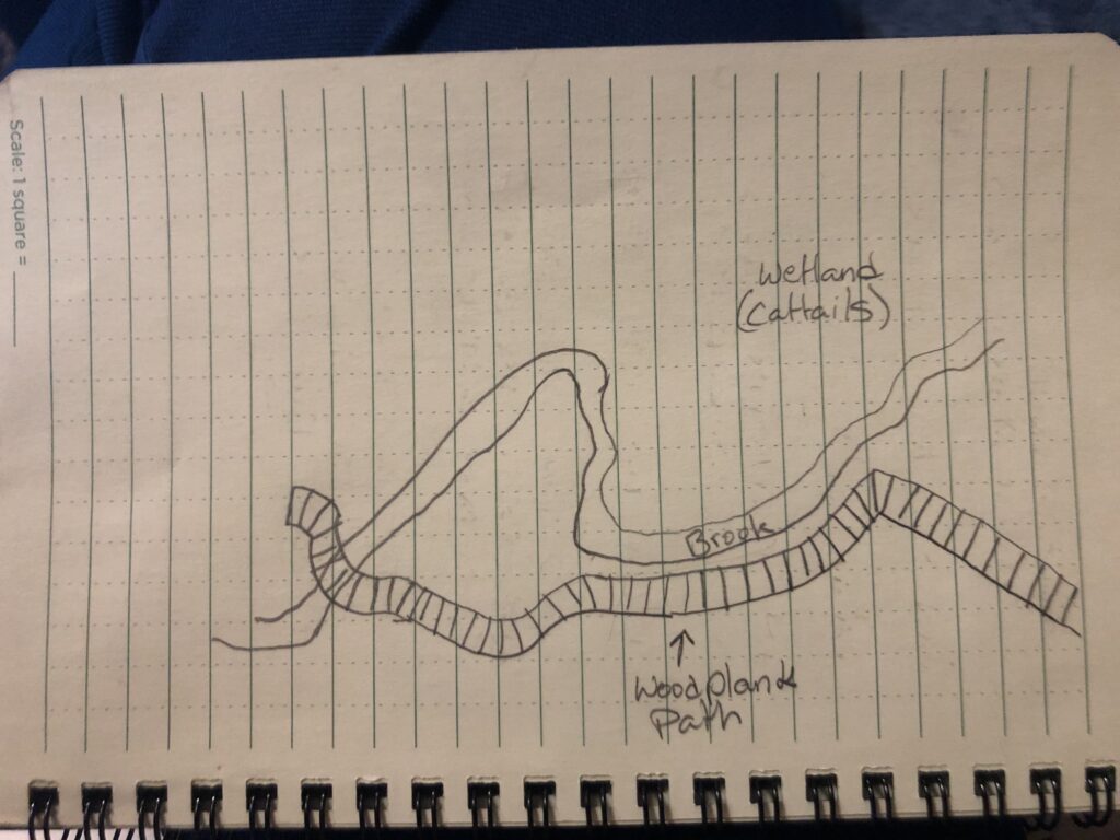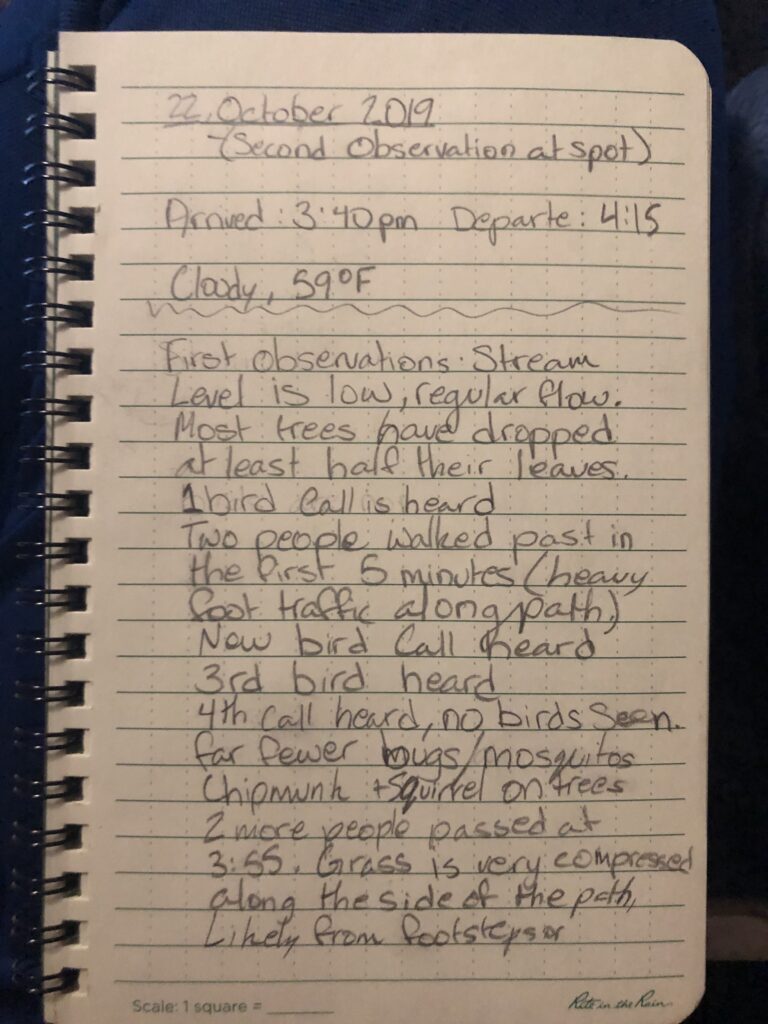 Welcome to my magical spot along the brook in Centennial Woods. This location just off of the wooden footpath that winds along the brook and deeper into the forest. My place is charming yet it also reminds me of adventure and exploration. My place on the brook is in a special spot located between both the forested Centennial Woods and the wetlands behind Centennial Brook. I am able to observe two different ecosystems. The forest is dominated by trees like the white pine, sugar maple, and cedar trees while the wetlands are dominated by cattails. Since I sit on the side of the footpath when observing I am reminded of the popularity of this location every time someone walks passed me. During the hour time period I spent at Centennial Brook, much of it was spent in silence with little to no “action” just the faint chirps of birds in the distance. Although, after about 35 minutes a large group of about 10 small gray birds moved into the area I was observing and began to feed on the seeds on the brush. With the small birds came a couple of cardinals as well as a large blue jay. After around 5-10 minutes of them feeding in front of me, they moved on and were out of my sight. I also saw many people walk past me, most were alone but some were with a partner. The grass next to the wooden footbridges were also worn down and I am guessing this has to do with people walking next to the trail or slipping off the wet bridge. I am glad to see that there is still a steady influx of students and Vermonters using the trails and it isn’t one of the things changing with the seasons. However, there are many other aspects of my spot that are showing signs of the fall and incoming winter season. The most obvious change of the seasons is the changing of the leaves. During my first time at my phenology site on September 30th, 2019, only a few trees at the head of the trail had begun to change color. Then on October 10th, 2019 almost all of the trees have changed color to their bright red, yellow, and orange hues. During my most recent visit on October 22nd, 2019, most of the trees had dropped at least half of their leaves. This shows that the trees are becoming less productive as they approach the colder season to save energy and resources for the winter. A few remaining trees and bushes still have their summer/fall fruit which organisms like chipmunks and birds are feeding on. Another noticeable change was the lack of bugs. The fact that there are no bugs means that there has been a frost which killed them. I’m stoked to see how else my spot changes!