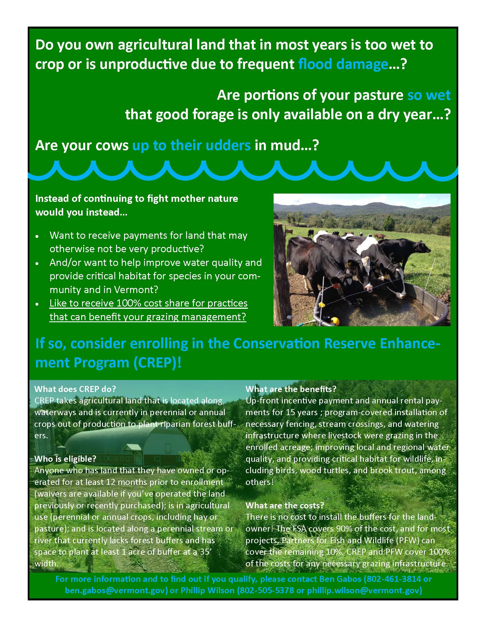For more information, visit https://agriculture.vermont.gov/crep or contact Ben Gabos at ben.gabos@vermont.gov or Phillip Wilson at phillip.wilson@vermont.gov.