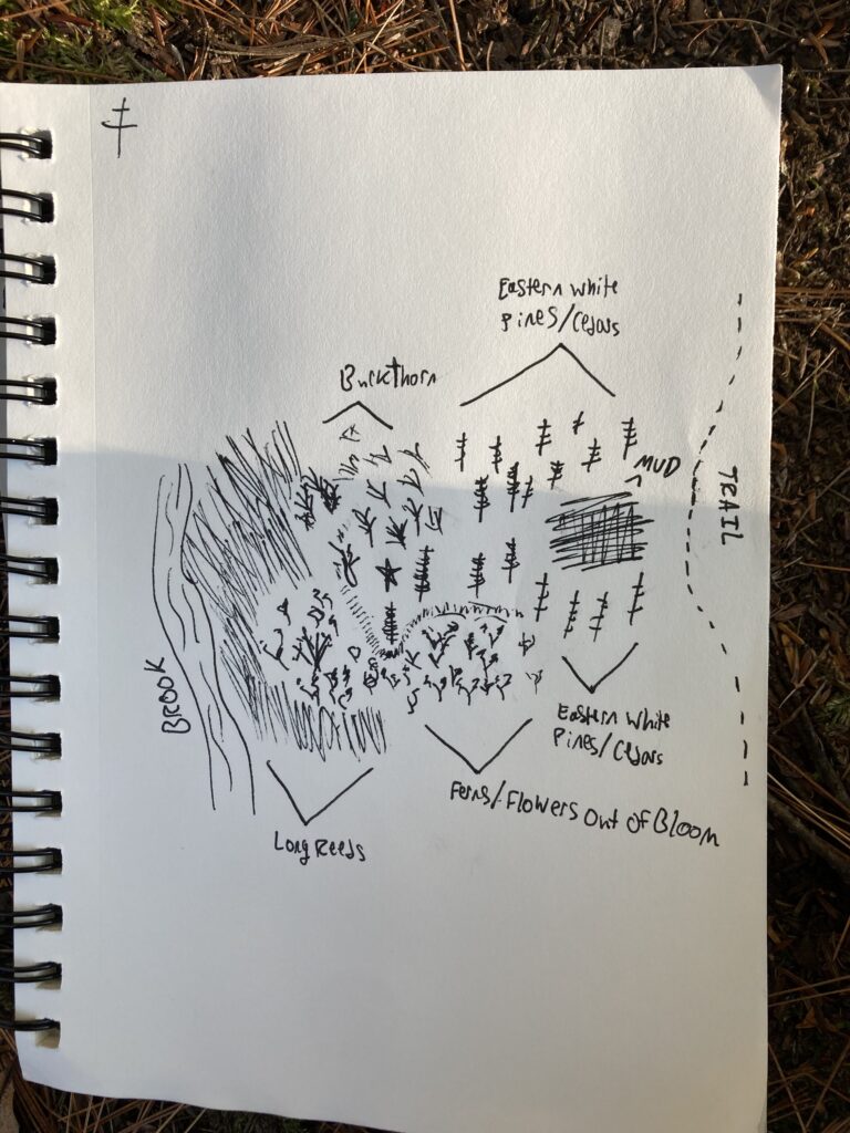 Reflection: The first 5 of my 15 minutes were sort of interrupted by people running with their dogs. After that, I started to get deeper into a meditative state, and feel more in tune with the spot. I felt the breeze and the hot sun on my arms. Towards the beggining, I heard a more warbly bird, and towards the end a screechier one, but other than that there was only the sound of falling leaves. I could smell the thick moss all around me.