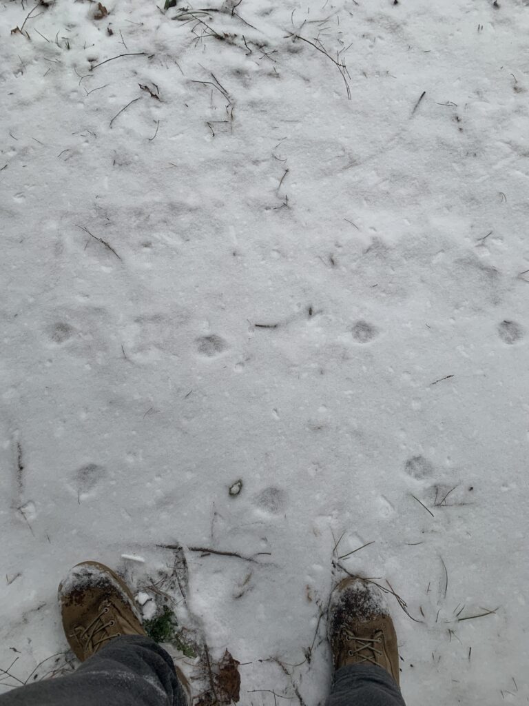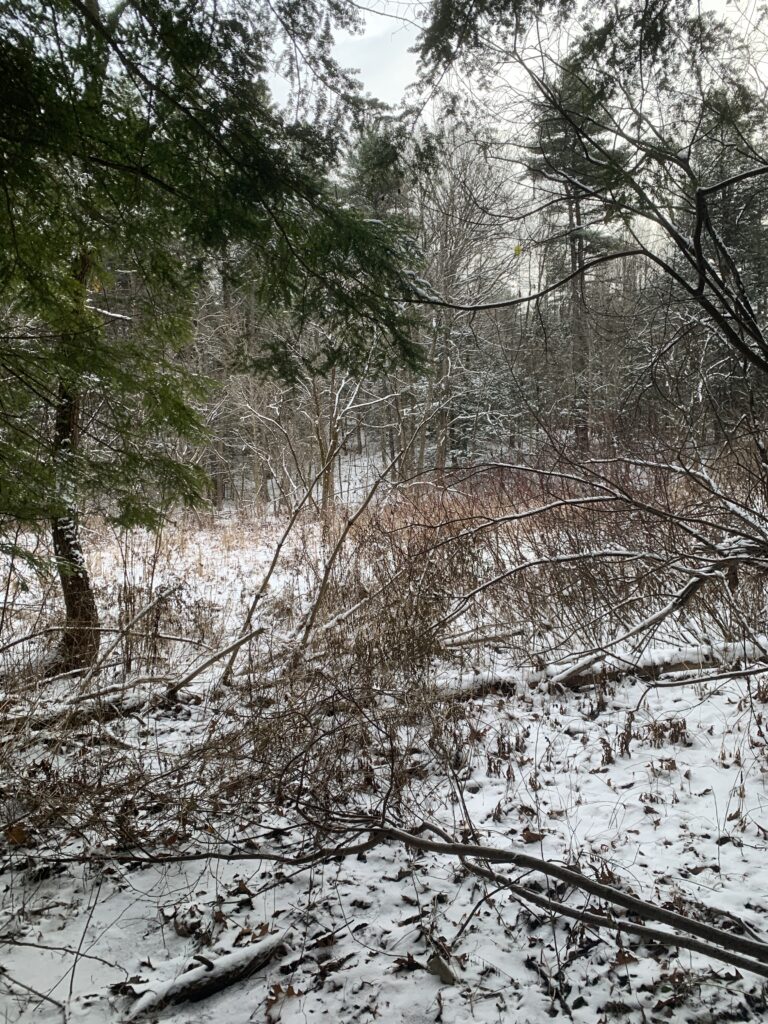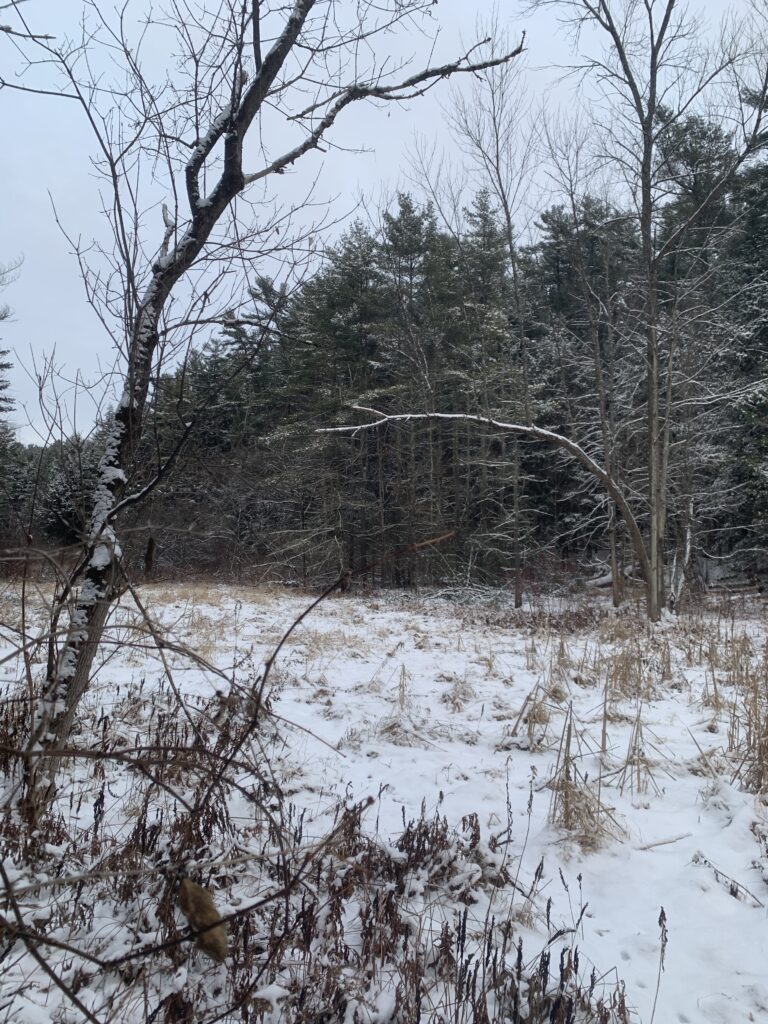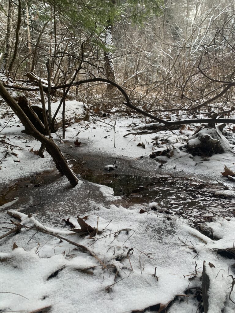 After that, I slowly made my way to my phenology site which didn’t have much in the way of wildlife, and while I love my trees –Eastern Hemlocks especially– I was looking for wildlife. Not too far from my site, the melted snow had exposed the beaten-down grasslands and the brook, so I made my way over there. The first thing I noticed when I stepped up to the Brook was little fish darting around in the water, I took my best guess when entering them into iNaturalist, but I’m still not sure.