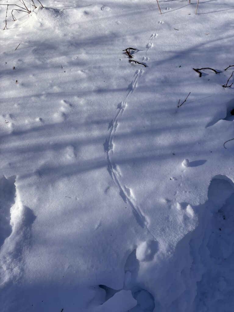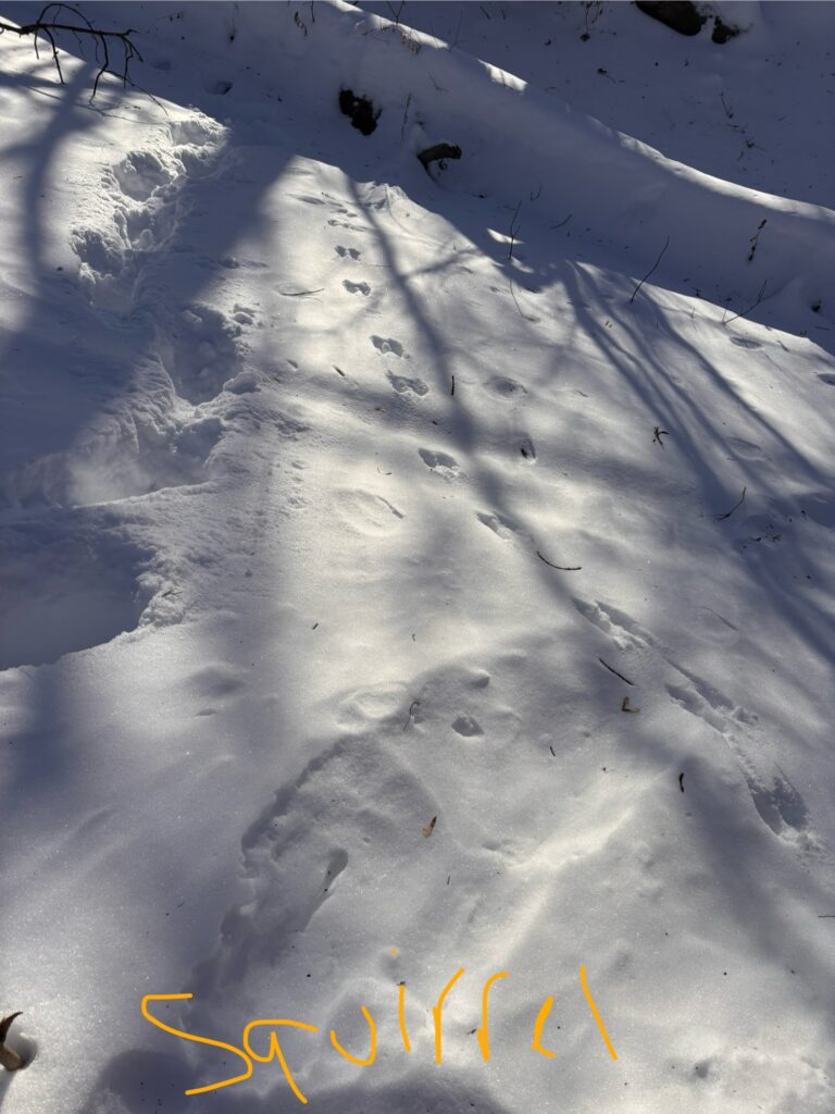 While walking around the trails of Intervale, I observed many mice tracks and a few squirrel tracks. The squirrel tracks led to a fallen tree covered in snow, and then we lost where the squirrel went from there. we were able to identify the mouse prints because they were thin and long prints that are connected by what looks like a tail drag. The squirrel ones were also easily identiable because the tracks matched what squirrel tracks look like as though it was running or hopping through the snow.