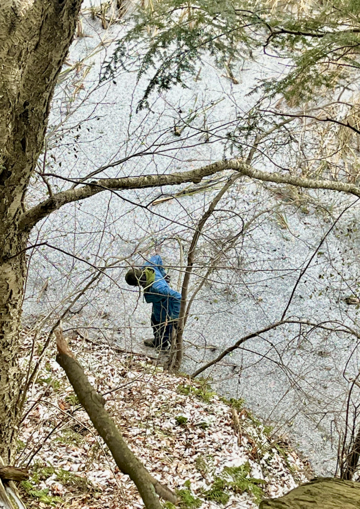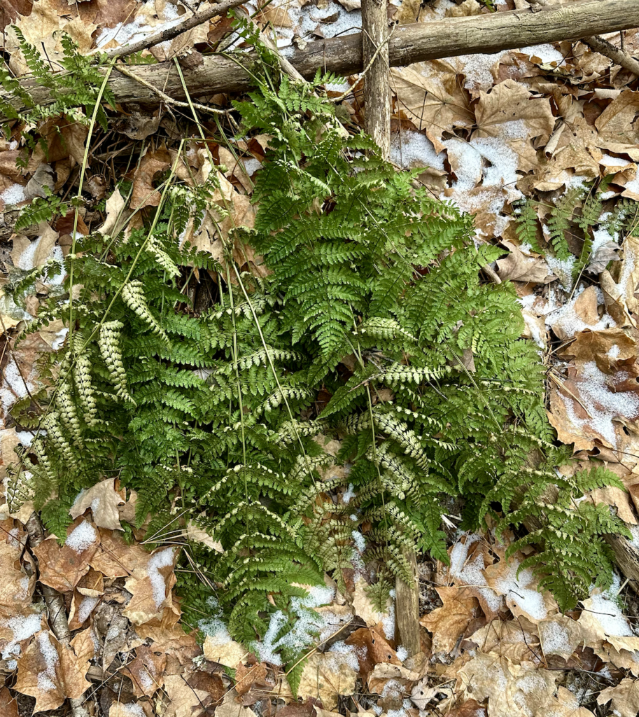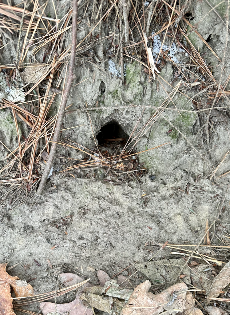 The foliage has changed here a lot since I came earlier in the fall. There are no longer leaves on the trees, except for the eastern hemlocks and other evergreens of the area. Small ferns and moss remain prevalent during the wintertime, continuing to grow on the ground and along rocks and trees. Decomposition is clear from the ocean of dead leaves that covers the ground, frostbitten by the snow that covers. I found a small hole I believe belongs to a small rodent in the area, other than this, there were no signs of animal life.