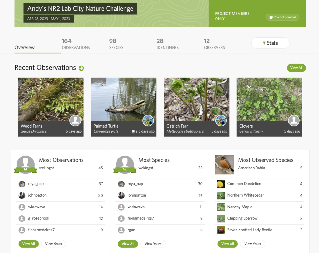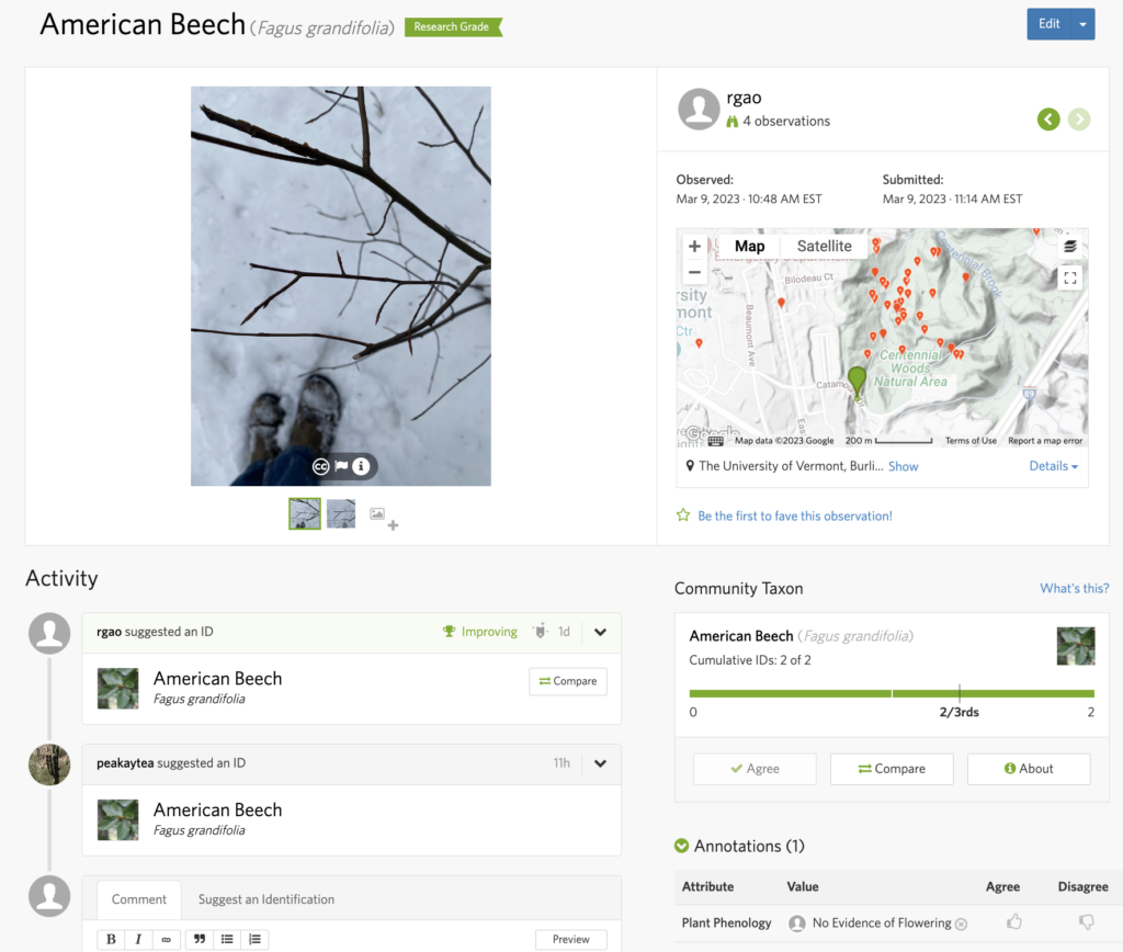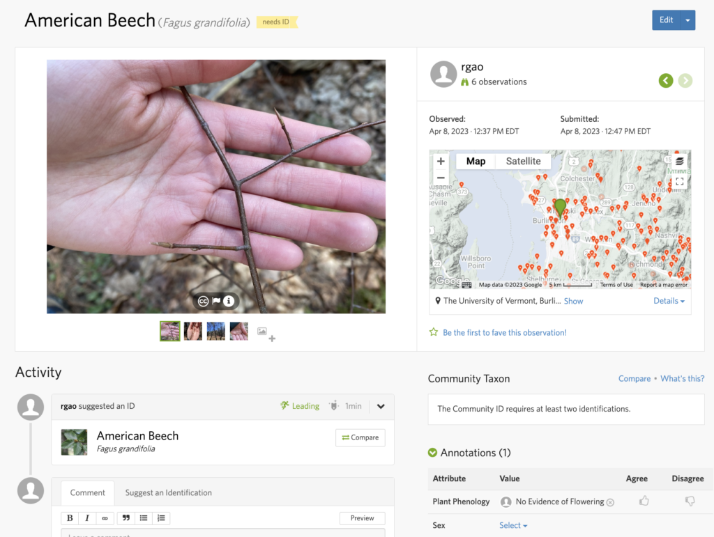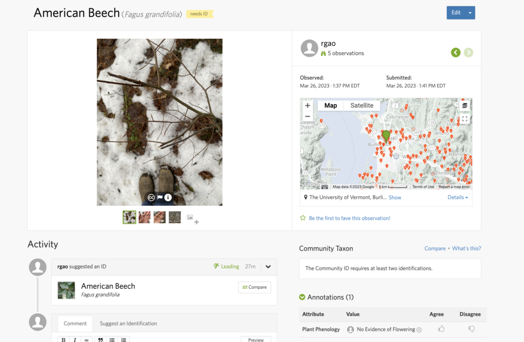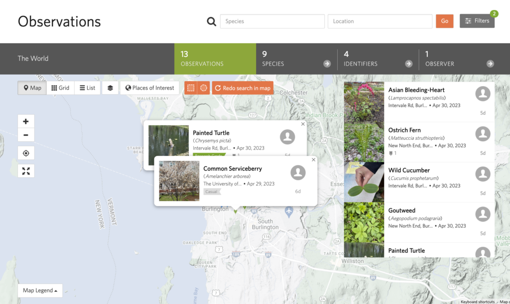 From 4/28-5/1, Burlington along with the global iNaturalist community participated in the City Nature Challenge. During this four-day BioBlitz, my friends and lab peers explored the greater Burlington area to record over 150 observations and almost 100 species. iNaturalist was fairly easy to use but I did not have service at some of the places I explored. Additionally, I found it a bit difficult to capture photos of birds as well as record their calls. Although my group did not get as many observations as other lab sections, I still had lots of fun exploring and getting involved! It was also so cool to see that compared to the global community, Burlington made the leaderboard even with our small comparative population size. It really goes to show how much the community values and engages with their natural community.