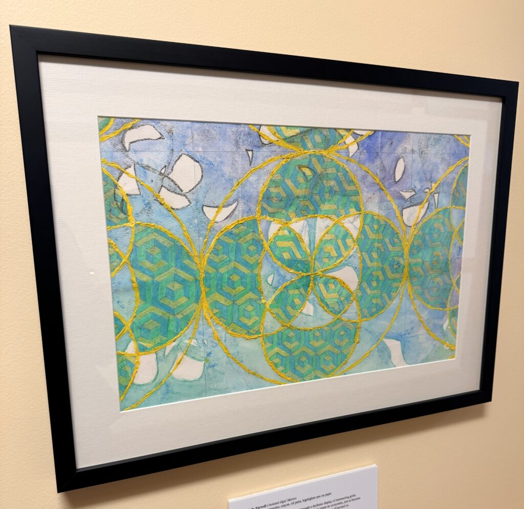 In this piece I tried to represent the way it feels to sit by a pond in the depth of summer and observe the sunlight filtering through the algae and the duckweed and into the depths. The colors and shapes that sunlight through water creates and the green patterns of algae and frogs’ eggs are entrancing. The sunlight through water is represented by the yellow interconnecting oil paint circles and the watercolor paint background. The isometric cube grid is reminiscent of the repetition and interconnectedness of organisms like algae and coral, how they are so small and yet so large at the same time. Intersecting grid systems are a recurring theme in my art. I find the process of constructing and coloring them meditative. Humans tend to try and organize things through labeling and separation. In this piece I emphasize how the many separate areas of pattern, shape, and color come together as a whole – just as algae, sunlight, and water create the basis of many ecosystems, and humans and all things on earth come together in our separate ways to create the world.