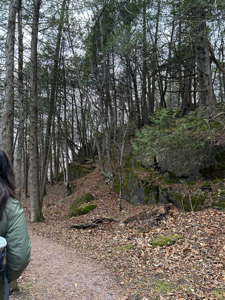 Today is December 9, 2023 and I visited Rock Point around 2:30pm. I noticed right away the dramatic decrease of color in the landscape since the last time I visited in the beginning of November. I took the same trail and sat at the same spot on the cliff overlooking the lake. There were no leaves on any trees besides the cedars and hemlocks. Animal activity has decreased significantly, save for one or two gray squirrels and a couple of ravens and seagulls flying over the water. I stayed for a couple of hours and watched the sun turned the sky a soft pink behind the mountains. There were a couple of dog walkers using the trails. I happened upon some deer scat in the meadow, it looked to be from within the last couple of days. I looked for tracks but sadly did not find any. The moss covering the large boulders in the forest were especially beautiful and the color was persistent. The ground was very dry besides a few puddles and muddy spots.