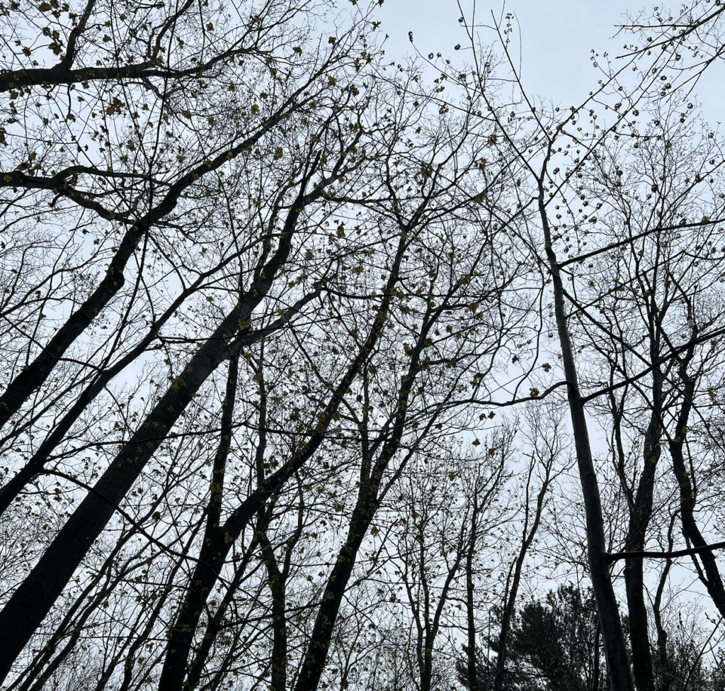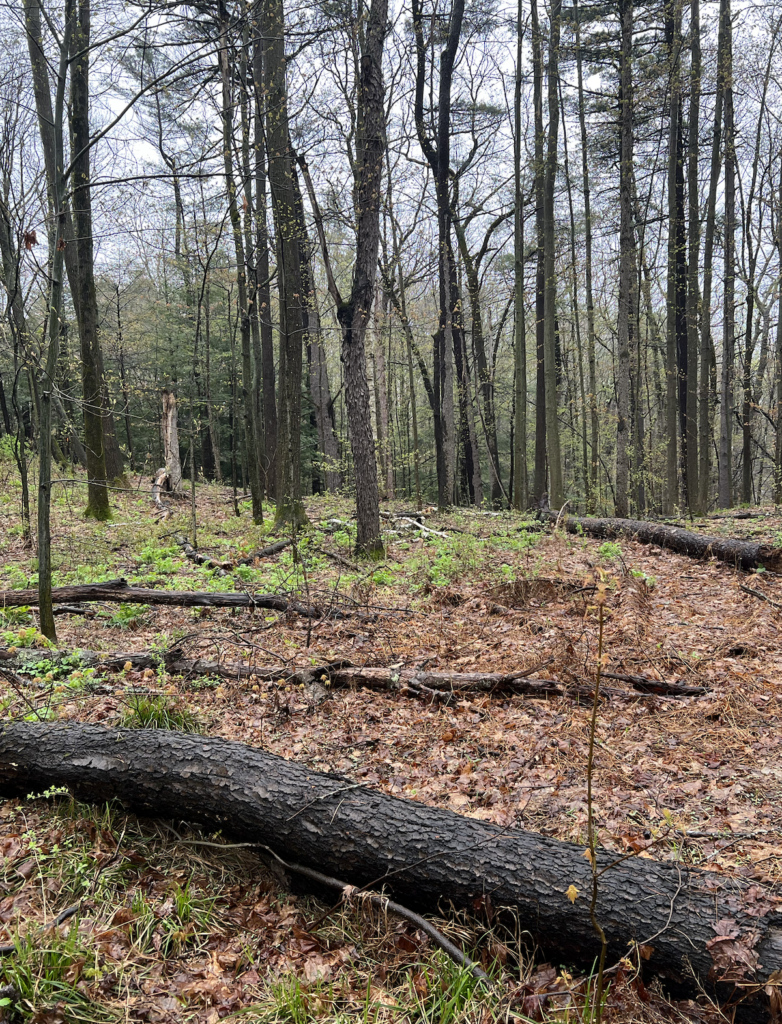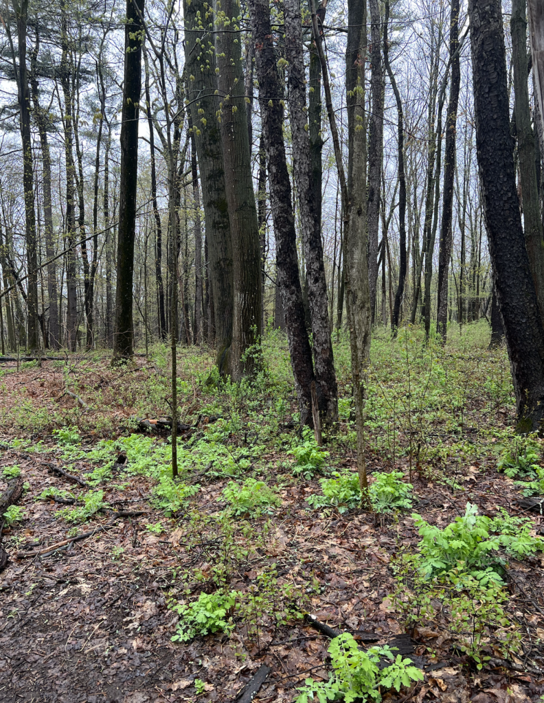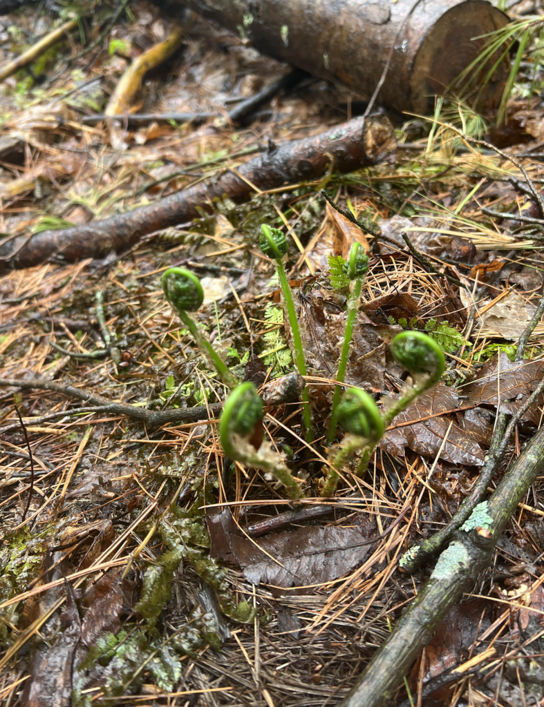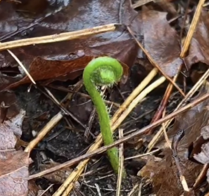 Physically, except for a few fallen trees that had previously been there, nothing has truly impacted my area. However, when it comes to phenological change, there are black cherry trees and baby sugar maples that are budding. Similarly, as seen to the right, there is a lot of greenery present in the understory, much of it is new. One thing that stuck out to me were the fern buds. I will put pictures below of the overstory and of a budding fern: