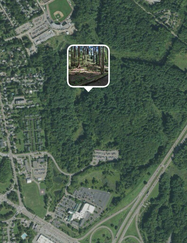 I heard the sound of the stream trickling, birds chirping in both the over story above and from distant trees, leaves rustling and falling in the wind, the cracking and creaking sound of trees, water dripping from the leaves, and chipmunk squeaks. I also could hear the sounds of the surrounding road from deep in the forest. I heard the sound of sirens, the beeping of a truck backing up, and the revving of engines.