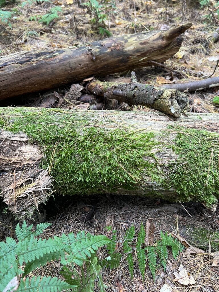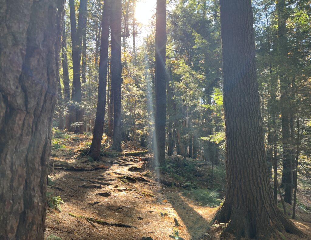 While sitting quietly in my phenology spot, I saw many areas where the sun rays poked through to reach the understory. I also noticed that while there were many areas of the trails with a thick layer of deciduous leaf litter, in my area there was still only eastern white pine needles covering the forest floor. I saw a mix of trees with yellow-red foliage and deciduous tress that still haven’t turned, and mainly evergreens. I also noticed that there is a lot of coarse woody debris in the understory lining the trail, along with many large standing snags. I also noticed that the stream in the wetland area was running a lot faster and stronger than last time because of the rain earlier in the week.