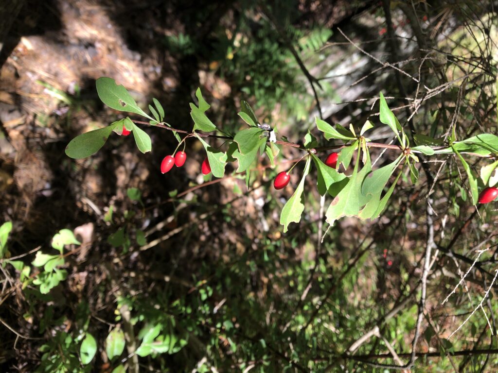 I am also still unable to identify this woody shrub in my spot. It has long leaves that sprout in bunches and red berries that each have their own stem. They are shiny and egg shaped.