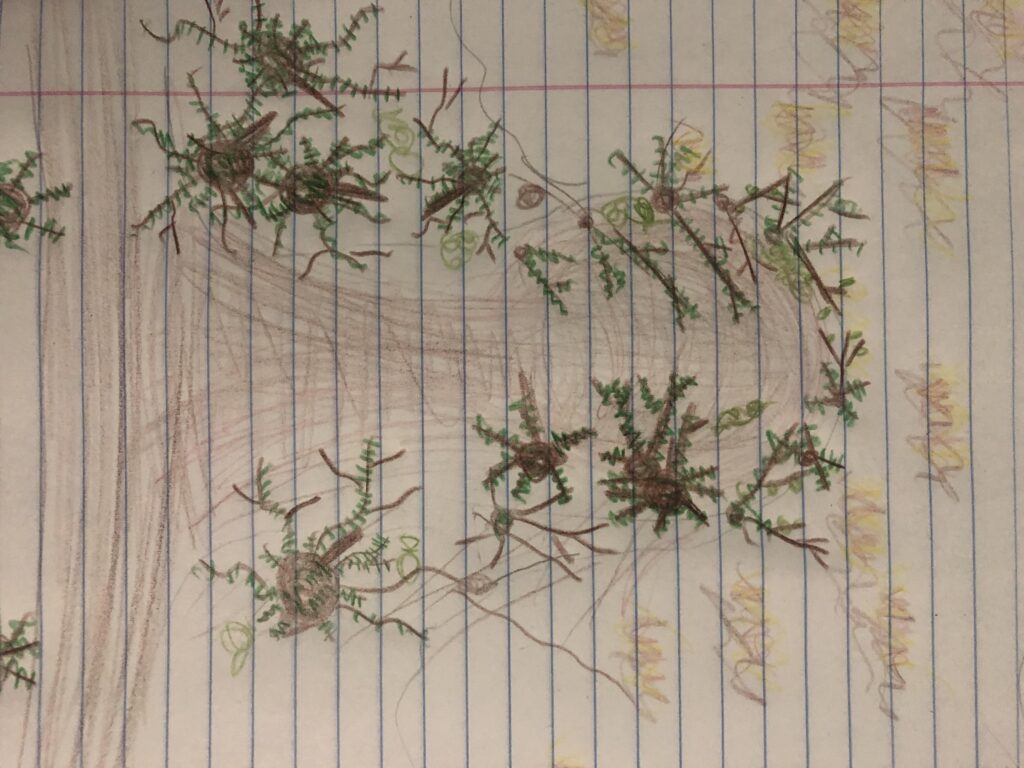 Here is my very rough sketch of my phenology spot from a birds-eye view or perspective. This is my spot coming off of the main trail which can be seen on the left of the paper. With the opening of wet lands with lots of yellowish-reddish bushes on the right side of the paper: