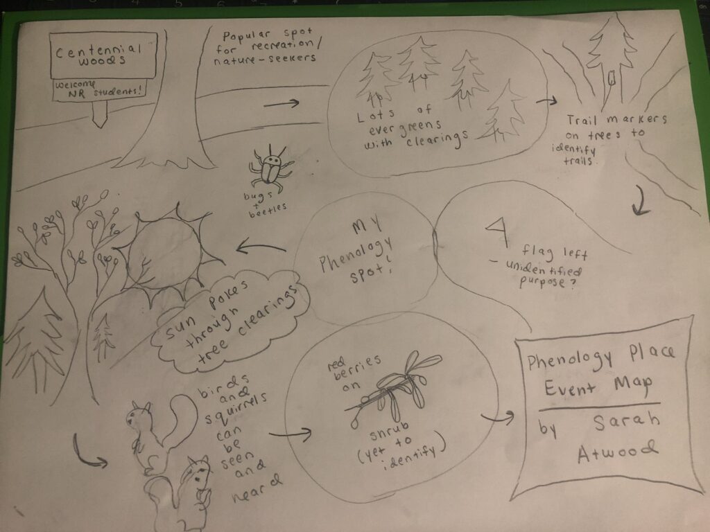 Along with my event map, this week’s assignment has challenged me to write an original poem about my phenology place. I wrote my poem about getting away from the stress of life by going into the woods. I was inspired by how even though there is a whole college campus, city, highway, and even an airport right outside of Centennial, when you are in the woods you can almost escape that chaos.