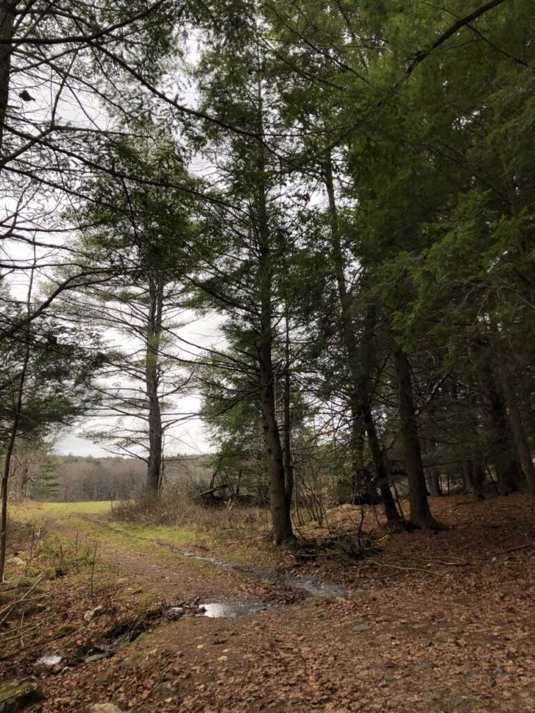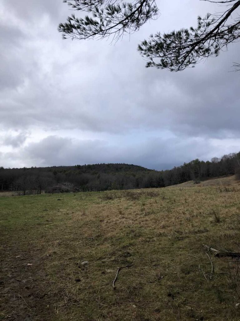 The spot I ended up choosing was this spot right at the entrance of the pasture. It has a lot of Northern Hemlocks and Eastern White Pines and it also has a little stream that goes down into a larger brook. I visited this spot on a very dreary day. It was cloudy and only 30 degrees out. I took a picture of the view of the pasture from my spot too: