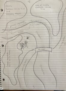 At my phenology spot there is a place where the river bends creating a bank that is perfect to sit on. This is where I spent my 15 minutes of observation. I had to put my jacket down to sit on because the ground was wet from the rain the night before. It was quite warm out for this time of the year, and there was a strong breeze. The Eastern White Pines are the tallest trees in the area and they were swaying a lot in the wind. The other most common type of tree in the area is Norway Maples. They were not swaying as much and they were still holding onto some of their leaves, unlike the rest of the trees in the area. There was some human traffic through the trails that I was sitting off of, but it was not loud or disruptive. The river was flowing steadily but fast over the rocks. It was a very peaceful experience and I now feel more connected to my place.