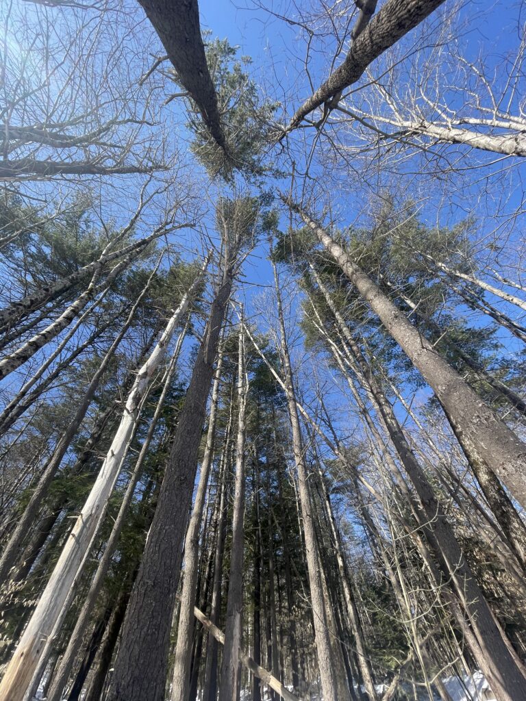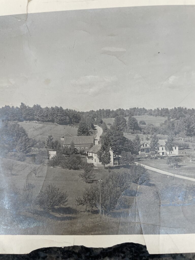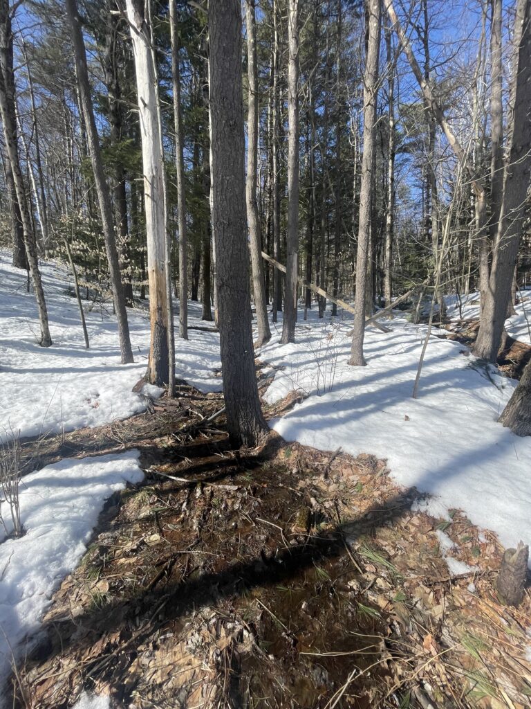 Over spring break I spent some time in outdoors in my home town in New Hampshire. For this phenology post I decided I wanted to focus on a spot in the woods that my family owns because I have a good understanding of the natural history of it. The land has been in my family for eight generations, and while I don’t know the exact land uses from the beginning I do know that from the 1800’s into the early 1900’s it was a working farm that raised cattle, sheep, and pigs among other things. The fields were also used as camping grounds for people who arrived on the Boston to Maine railroad system. In 1890 it became an Inn which is still the primary use of the land up through today. The landscape photo in the bottom left is from 1918 which I believe is right before the reforestation began in the spot that I visited.