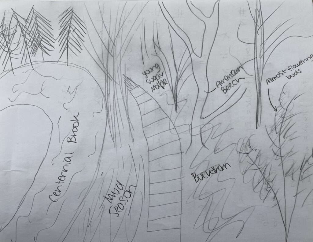 Since October, I have had the pleasure of observing the phenological changes that my site in Centennial Woods experienced, from the famous Vermont fall to the -40 degree Fahrenheit real feel of winter and to mud season Spring. The changes in plant species where the trees and shrubs were full of leaf coverage to slowly dying off of branches and “hibernating” through the winter and now, restarting its life as a bud ready to flower and return to its max strength form. Similarly, the relatively strong presence of wildlife that got quiet in November and now, you can hear birds chirping all the time and the faint noise of pollinators. Throughout the months, my site in Centennial Woods has remained intact. While water levels of the brook that navigates its way through Centennial fluctuated from month to month, everything else has luckily remained the same. This year, we experienced some extreme weather and will continue to, yet my site remains the same and has the ability to continue to support the natural system that it is supposed to support.