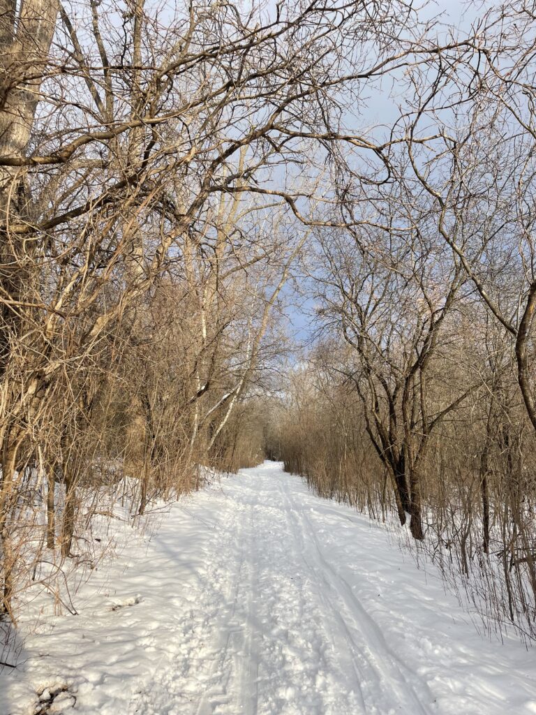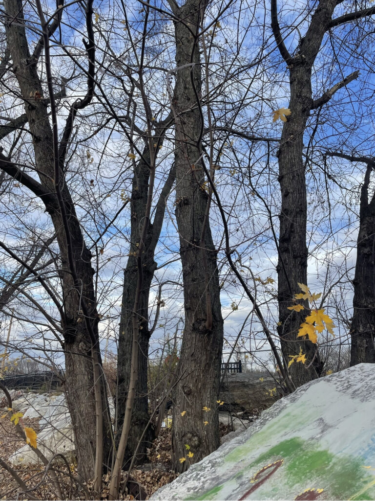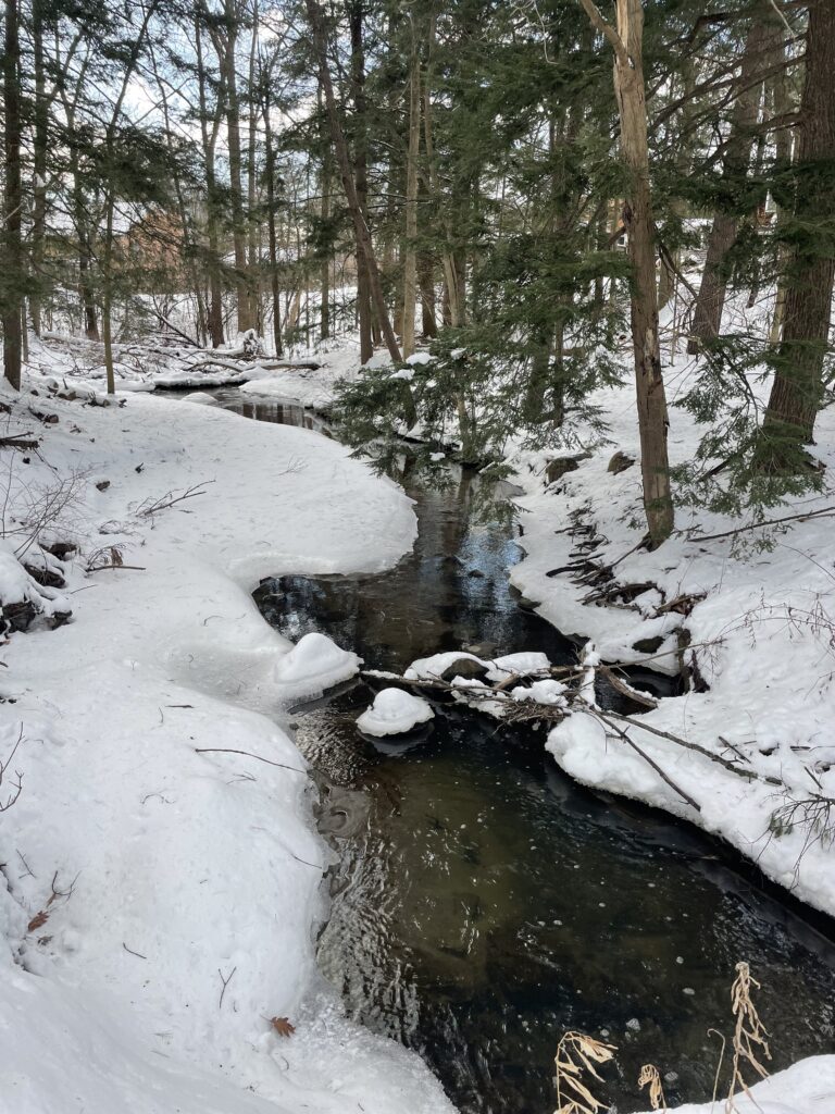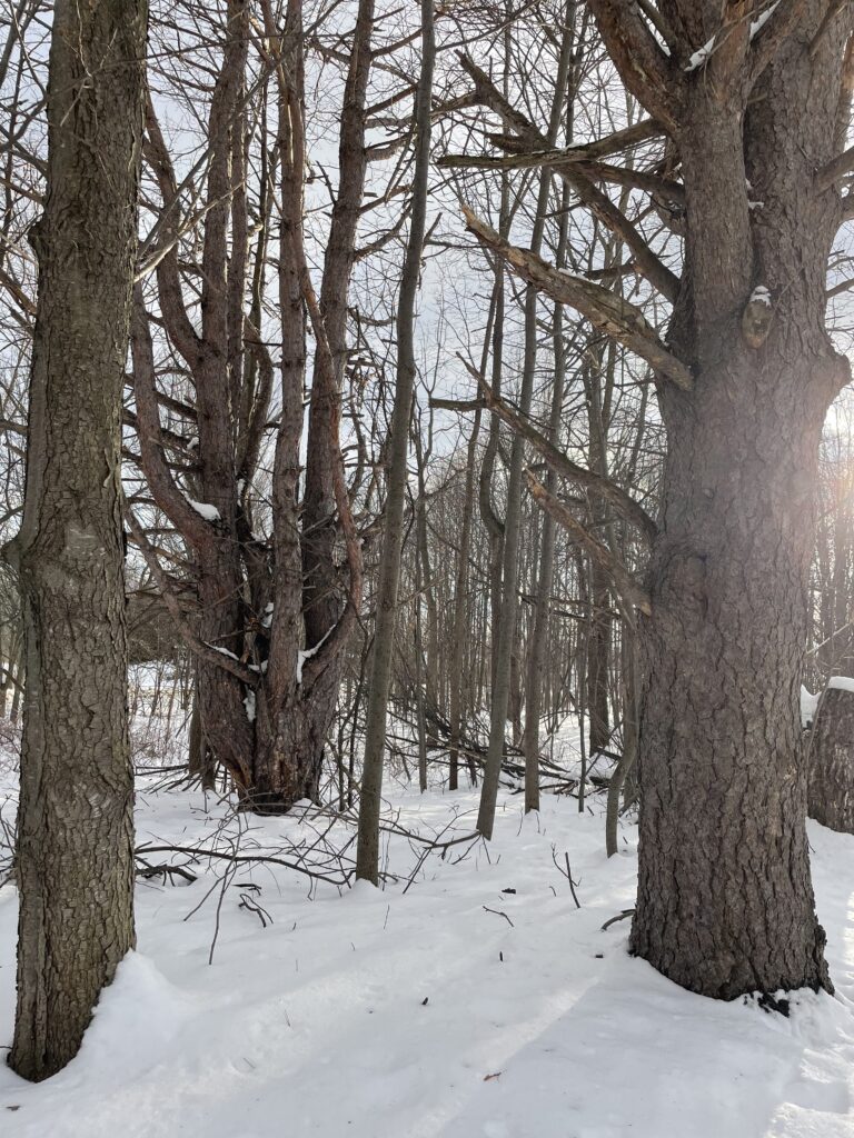 I’ve become very familiar with the small wooded area near the gold course. I have been running through it since the beginning of the school year but when I first tried to reach this spot walking I got so lost that I was just wandering around the gold course because things looked different when there is a foot of snow on the ground. Now I am more familiar with the little walking loop that will take you to my spot and I can find my spot by looking for the older trees off of the younger path!