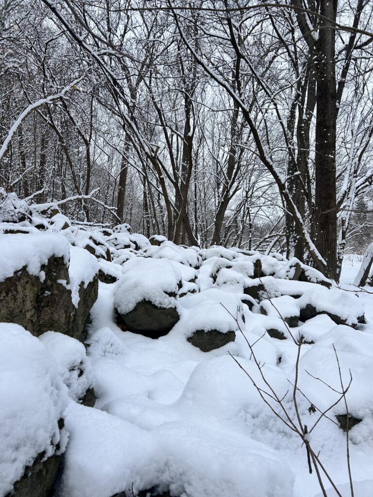 Visiting and becoming more educated about my site has revealed a few landmarks that I observed throughout the seasons as they changed. Firstly was the large Japanese Knotweed bush that was thriving, died, and is now blooming again. Due to it’s invasive nature, it would have been beneficial to remove the plant in the winter when it was dead. Secondly, I observed the status of the riverbank and the accumulation of trash changing from fairly polluted, to iced over, then even more polluted then before. Finally, I observed the change, or lack of change, of the rock pile at the back of my site. While little physical differences were observed of specifically the rocks, it was a great way to see the difference in coloration of the site throughout the season.