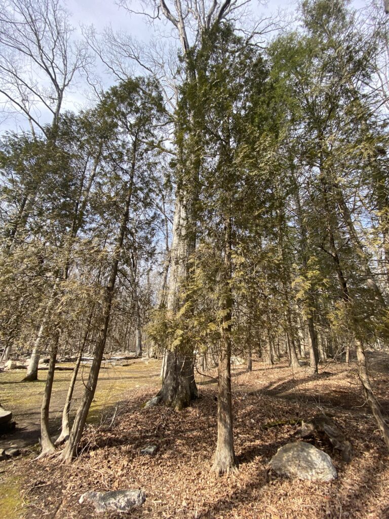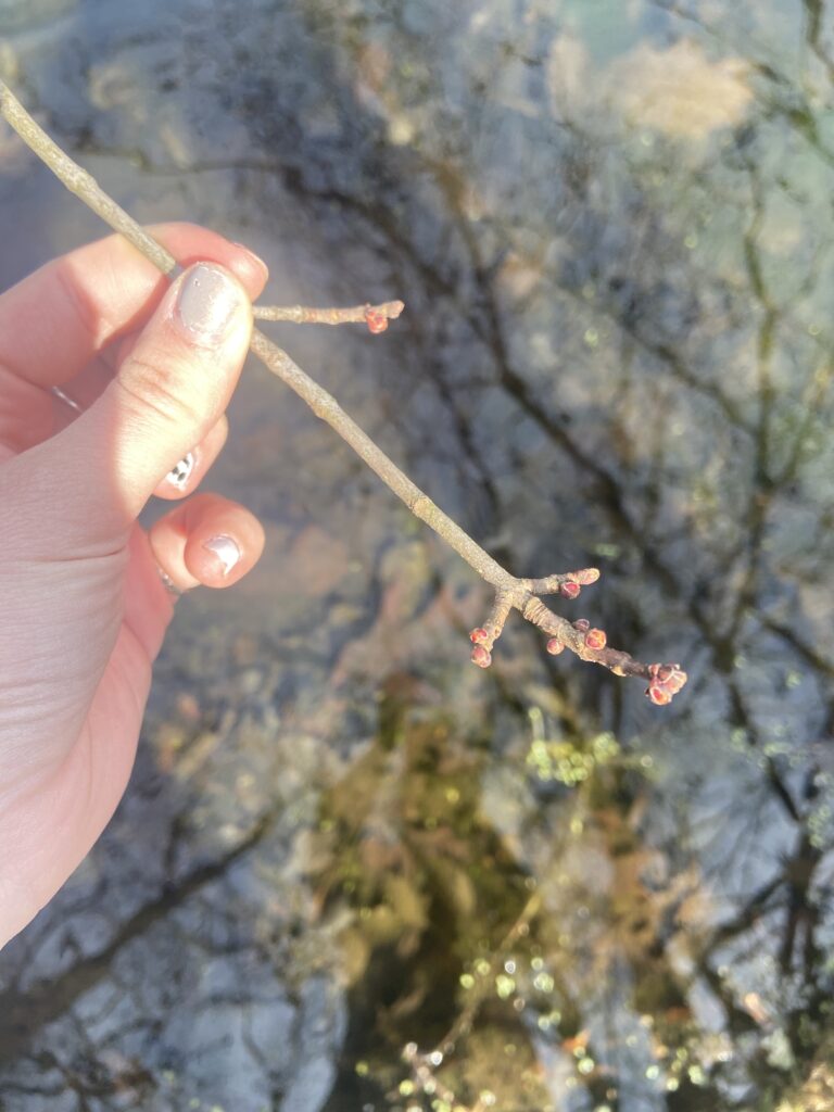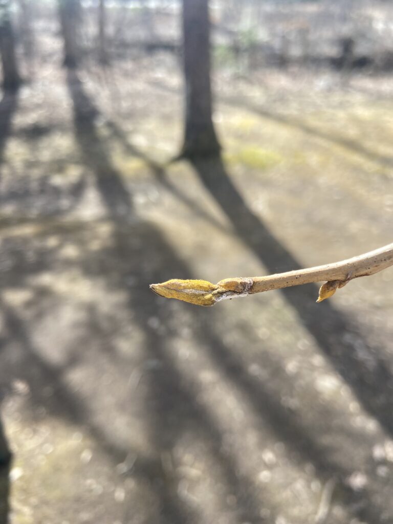 When I arrived, I was greeted by shining sun but not as much phenological action as I was hoping to find. Most of the woody plants in this spot were still recovering from winter, but were definitely still in good condition. There were many dead branches dipping into the pond likely as a result of the snowstorm we received the weekend prior. There wasn’t much woody plant growth on the ground but there was a nice mix of tree species in the area. I saw some red maples, sugar maples, an american beech growing in the understory, and some northern white cedars glowing in the sun. There was one tree that I just couldn’t identify however since the buds were growing out a bit already and iNaturalist was unable to make a clear guess based on the buds and the bark. The buds were soft, long-ish, and yellow. I’ll provide an image if any of you have any guesses please let me know!
