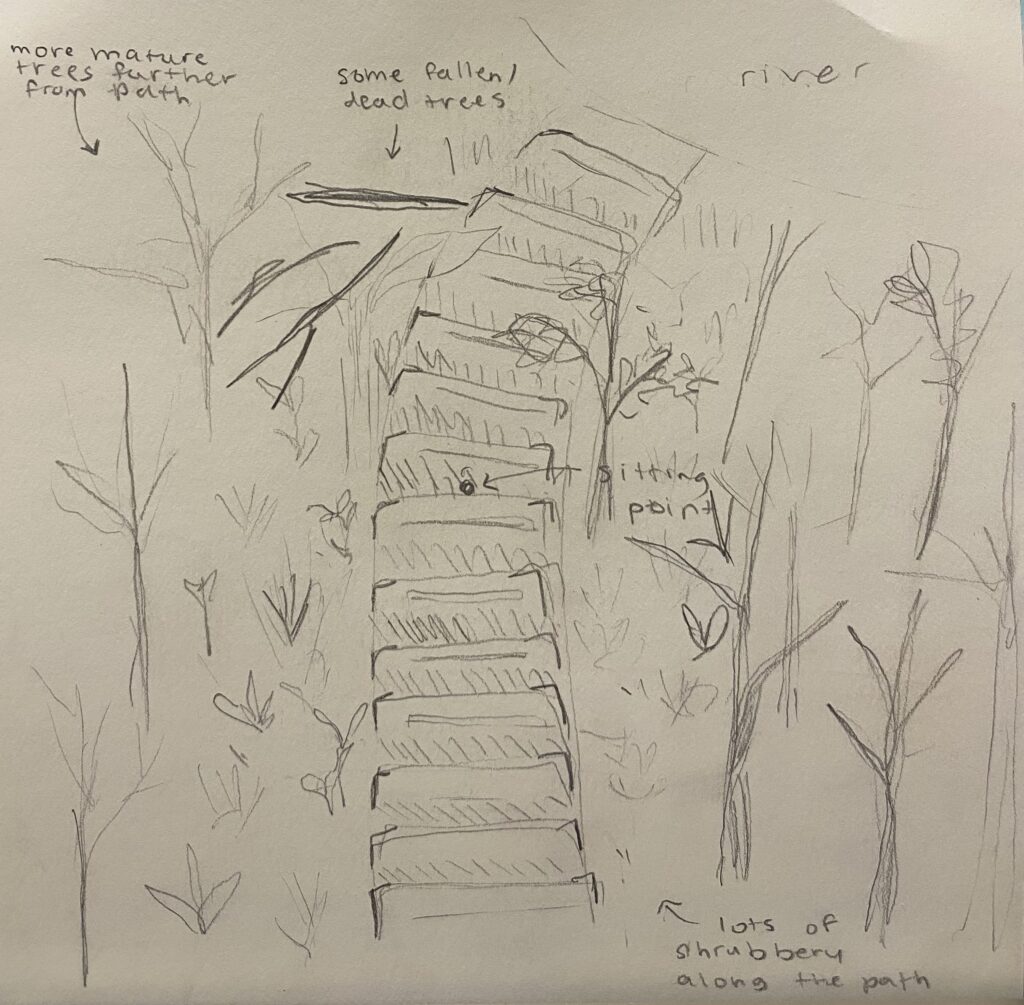 While sitting in my plot quietly for 15 minutes, I felt that I was in a fairly open and calm place. I could hear sounds of birds and the river at some points, but at other points traffic sounds overtook the sounds of nature. The car sounds made me feel like I was not fully immersed in nature, along with some trash that was left along the trail.