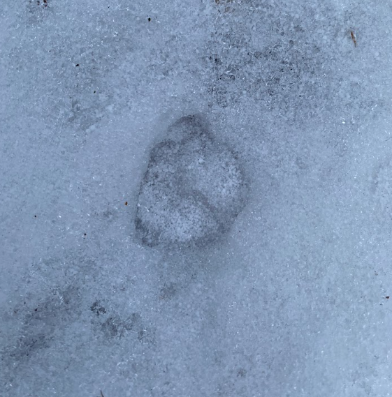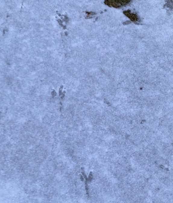 At my new location, I found a few signs of animals, though they were difficult to identify. First, I found a pair of tracks from what I’d guess to be a fox. I am just beginning to identify tracks, so my guess is as good as any. The second pair was from a bird. While I was there, I saw a large flock of birds in the trees at the golf course and I believe the tracks belong to them. I snapped a few pictures of the tracks and some of the general area at my spot.