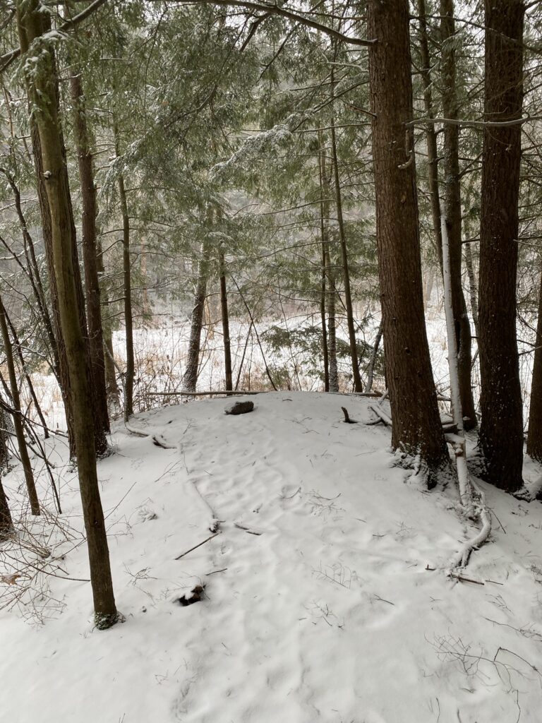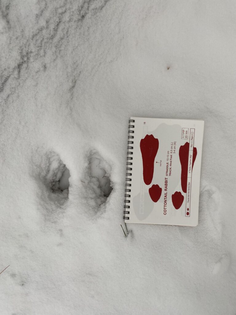 Winter has officially dawned upon my phenology site. While walking into the Centennial Woods to my site, I found myself in calm, still woods that were readying up for the big snow storm on the way. I followed the footprints what seemed to be a human accompanied by their dog straight to the Eastern White Pines that surround my spot. All vegetation in the understory is in complete hibernation, with the only green in the vicinity coming from coniferous trees. As I was walking around my spot to find any trace of active wildlife, I stumbled upon a path made by a small mammal. After careful examination, I concluded that I found a Cottontail Rabbit track due to foot size and the bounding path it created in the snow. The trail rabbit trail started around the actual trail through the woods and made its way towards the marsh down below. I expect my sight to sleepy and calm for quite some time, yet the smell of spring is ever so slightly there!