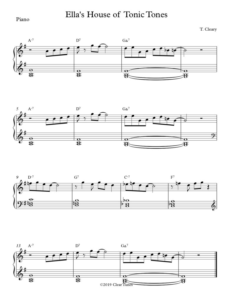 I composed the tune below, ‘Ella’s House of Tonic Tones’, while teaching a class called ‘Ella-vated Improvisation’. It’s based on the ‘solo changes’ (the chords used for improvising) to Sonny Rollins’ Pent-Up House. Below you’ll find a keyboard video of me playing the tune, along with sheet music for piano, and Bb, Eb and bass clef instruments. In ‘Ella-vated Improvisation’, we studied a number of Ella Fitzgerald’s scat solos from the album ‘Ella Fitzgerald sings the Duke Ellington Songbook’. On this album, in addition to singing Ellington’s tunes with lyrics, Ella functions like a horn player in the band, singing along with soli sections and improvising, both in extended solos of her own and in trading fours and twos with other soloists. Ella’s solos on ‘Satin Doll’ and ‘In A Mellow Tone’ from this album were the inspiration for the melodic line in this tune. (Thanks to Amber deLaurentis for her transcription of the ‘Satin Doll’ solo and Carly Flatau for her transcription of the ‘Mellow Tone’ solo.) ‘Ella’s House’ could be described as an imaginary Ella melody line on Rollins’ chord progression. In this sense it could also be described as a work of musical ‘fan fiction’ (the term for writing by fans of well-known books, films, etc. that creates new adventures for well-known characters. A portal to various kinds of fan fiction can be found here.) As with any piece of fan fiction, it is crucial to know the original sources that the variation is based on, so it is crucial to listen to the three tunes I linked to above before learning ‘Ella’s House’. Here is a link to a three chorus playalong at a slower tempo that will allow you to play the melody, one chorus of improvised solo and a return to the melody.