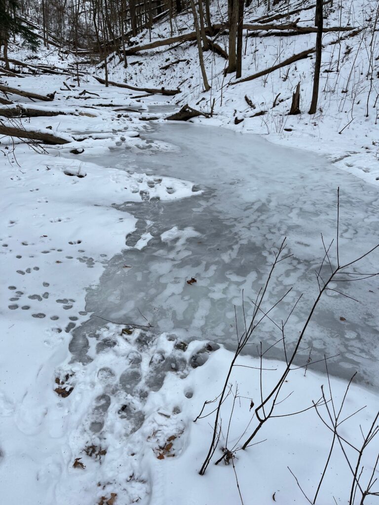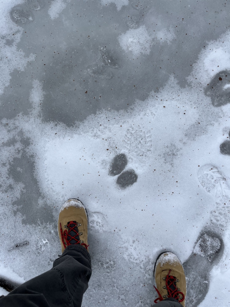 It’s been a little over a month since I last visited the stream. Last time I was there, ice was beginning to seep in through cracks in the earth, and the ground was cold and solid. Now, it is a sea of pale white snow, and what was once a meager trickle of water is now frozen over into a plane of ice that would make a great skating spot. It is evident that my buddy and I were not the only visitors, as tracks were etched into the snow almost everywhere one could look (more on that later).