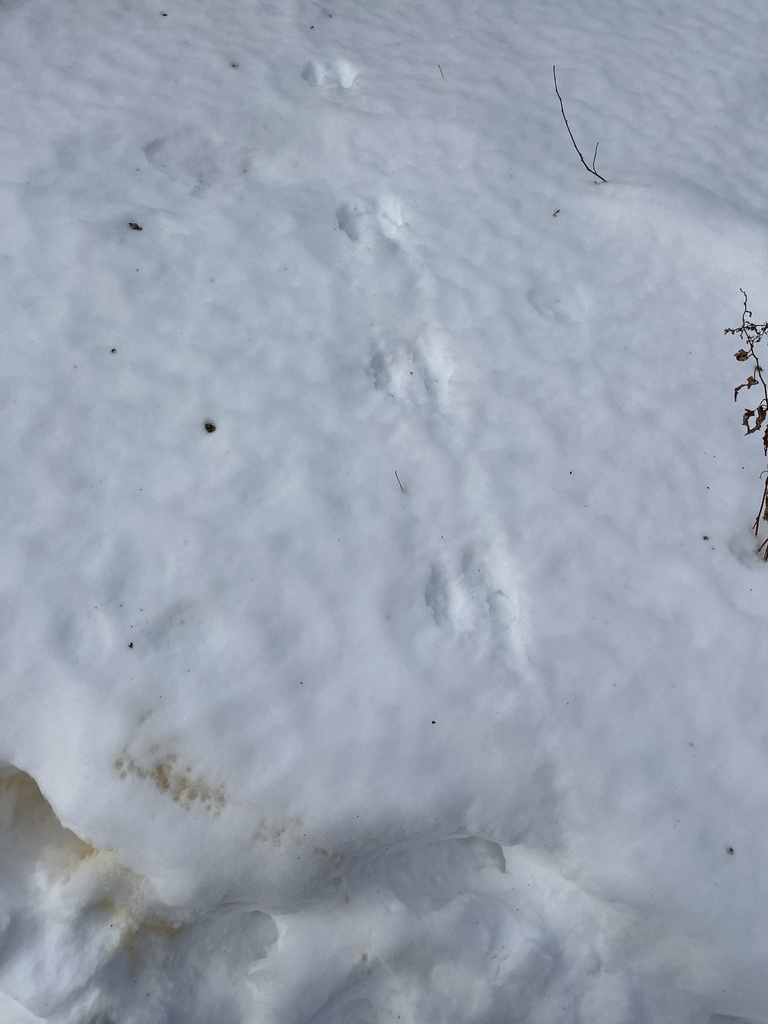 At first glance, one might think they are deer tracks. However, I had a sneaking suspicion that they belonged to another animal, but had been denatured over time. Deer are diagonal walkers, whereas these tracks were in a straight line, which suggested rather than the two imprints being one track, they were actually two, in a bounding pattern. I didn’t have a ruler on hand, but looking back at my Mammal Tracks and Scat Life-Size Pocket Guide, based on size, I was between the ID of a fisher and otter. However, I didn’t see any body slides, and the tracks didn’t head in the direction of the water, so it is less likely to be an otter. I posted it to iNaturalist under the ID of a fisher. (Linked here)