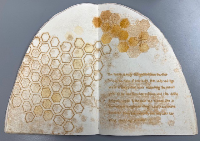 Photograph of a page spread in a hive-shaped book showing gold honey comb patterns and text about bees.