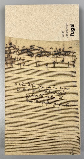 Cover of a tall, thin book with a handwritten musical score below the author's name, Susan Johanknecht, and the title, Fugal.We expanded our collection of books from  Susan Johanknecht’s Gefn Press with nine works made between 2014 and 2025. Johanknecht established Gefn Press in 1977, the same year that she graduated from the University of Vermont. The additions include her latest book, Fugal, produced in collaboration with Claire Van Vliet at the Janus Press and Andrew Miller-Brown at Plowboy Press. The artist explains the creation process,  “Fugal was written in response to descriptions and listenings to Bach fugues. Procedures used in the composition of the fugue were applied to build a poem which speaks to its musical source yet becomes an autonomous text.” The cover presents an image of Bach’s last known musical score.