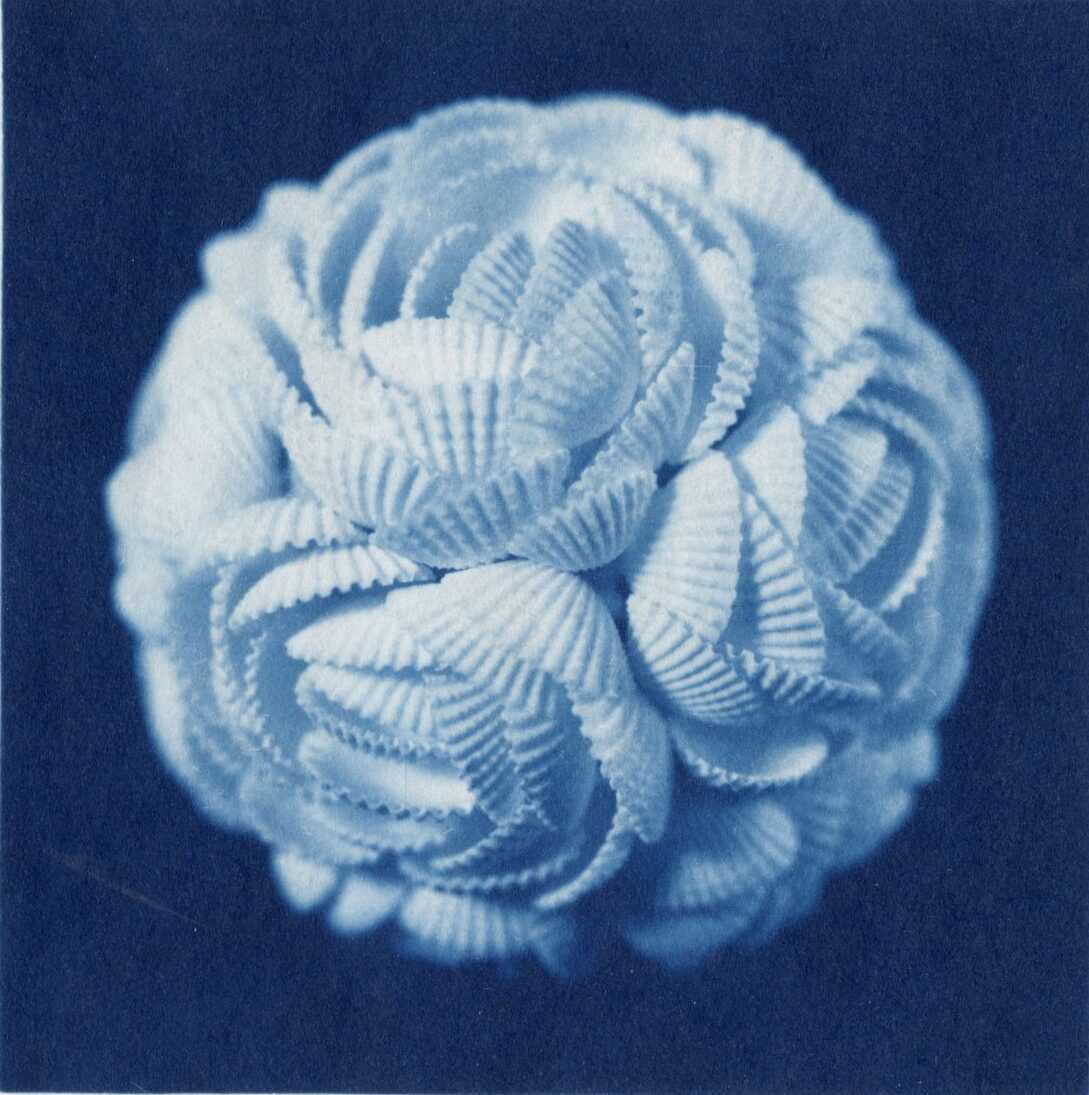 Blue-toned photograph of a round ball made of white shells.Two of the recent acquisitions use photographs in very different ways. David Sokosh’s Things That Look Like the Moon (but are not the moon) explores perception versus reality. He presents 16 photographs of round objects that look like the moon, but are not, such as a ball of string, a melon and the modern version of a nineteenth-century valentine made from shells shown at right. A short explanation accompanies each photograph. The book is cyanotype-printed, creating a unique set of blue moons.