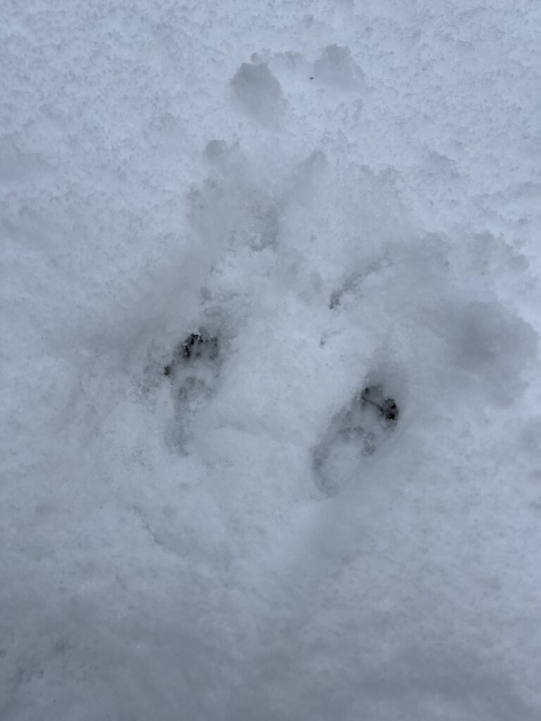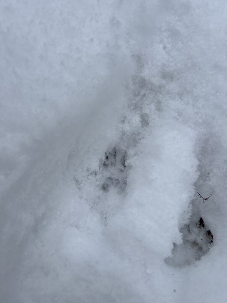 Though not very obvious, I could see a few trace of animals like squirrel marks on trees that I had seen in other areas of the forest before. It was a little hard to tell if animals had been through the area because of the human disturbance of the snow and the snow itself covering any marks that would have been in the mud/dirt, but I was able to find some squirrel tracks in the snow! It does seem like animal activity (at least birds) has decreased, however. I didn’t see or hear as many in the area.