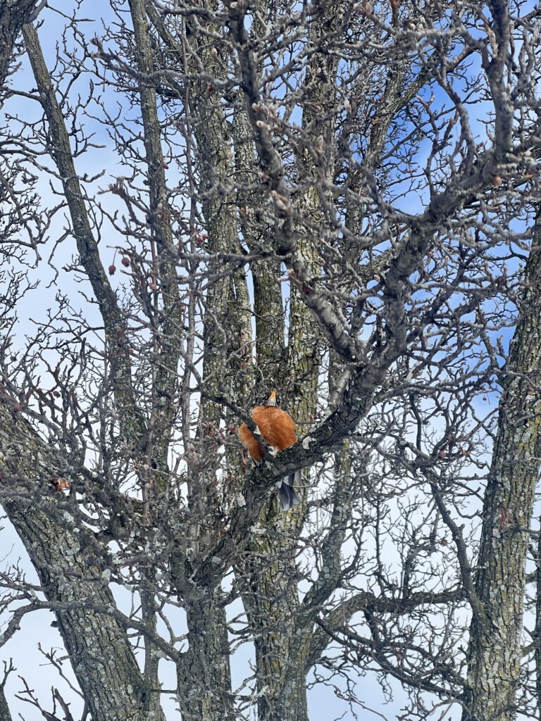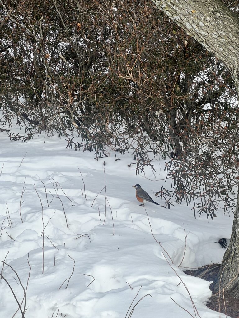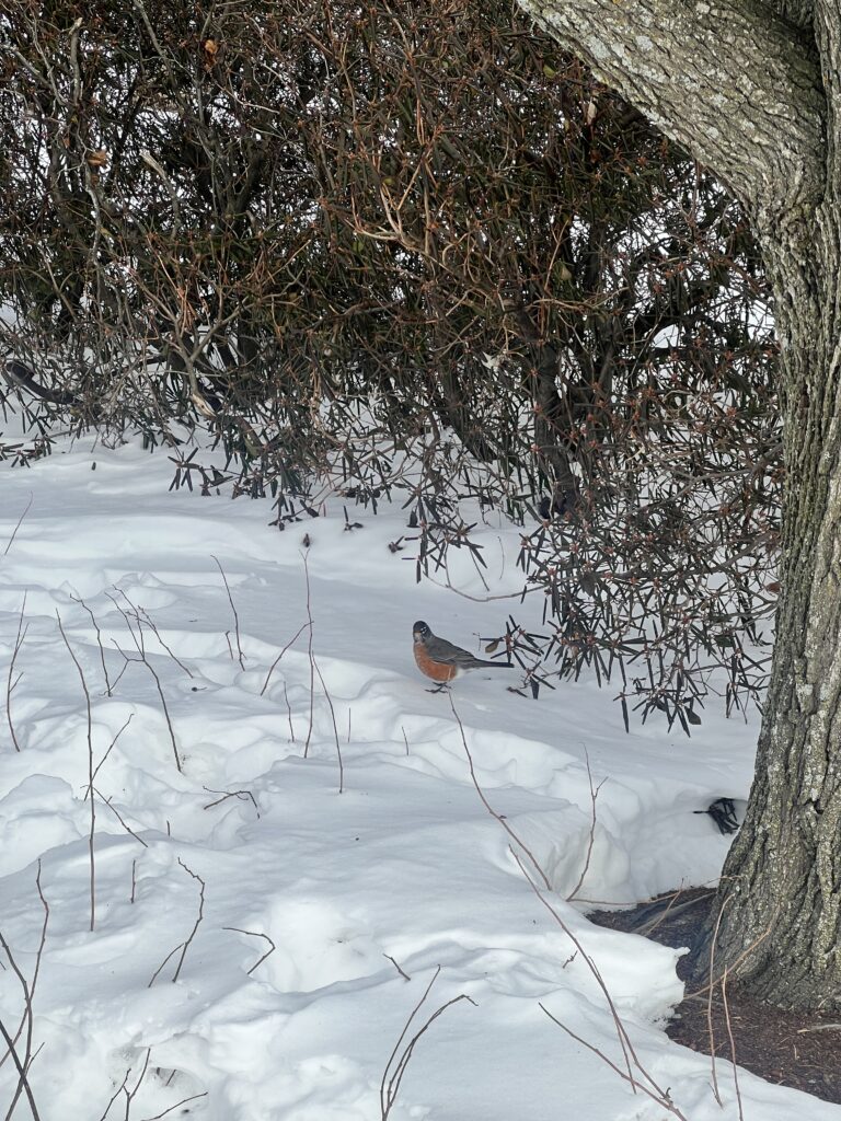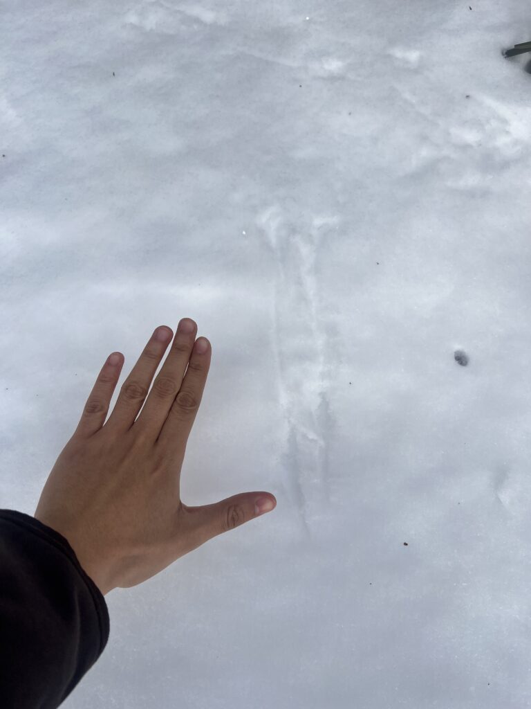 We saw many American Robins flying around and eating berries off of trees (unsure what type) on the waterfront. The robins were easy to identify by their orange and grey feathers, and we also took the time to observe their tracks in the snow. They had a hopping gait that had about 4 inches between each set of tracks. Walking along the bike path we also heard cardinals (we confirmed it with the Merlin Bird ID app) and saw one flying which was easy to spot due to the bright red color. We also did see a squirrel next but no squirrel tracks in the snow around it. I thought it was a bird nest at first, but it is most likely a squirrel’s because they tend to use more leaves whereas it is more rare for birds to use leaves in their nests, especially robins.