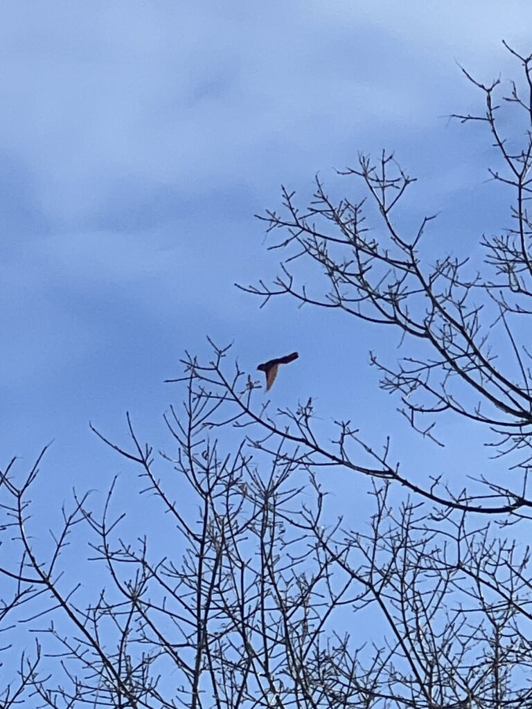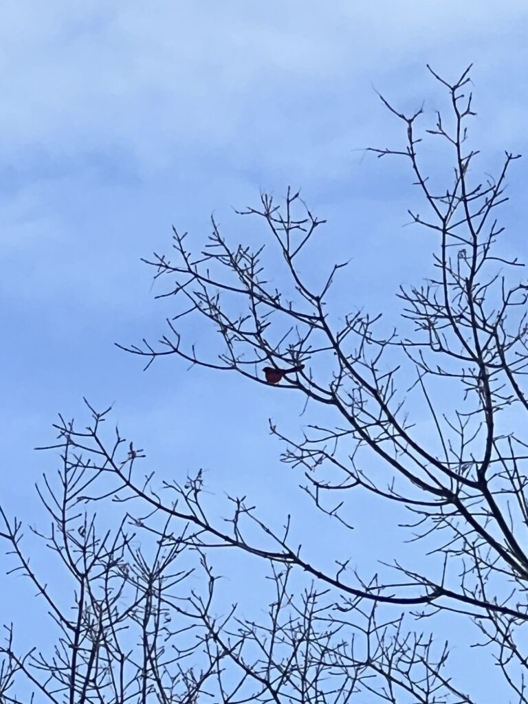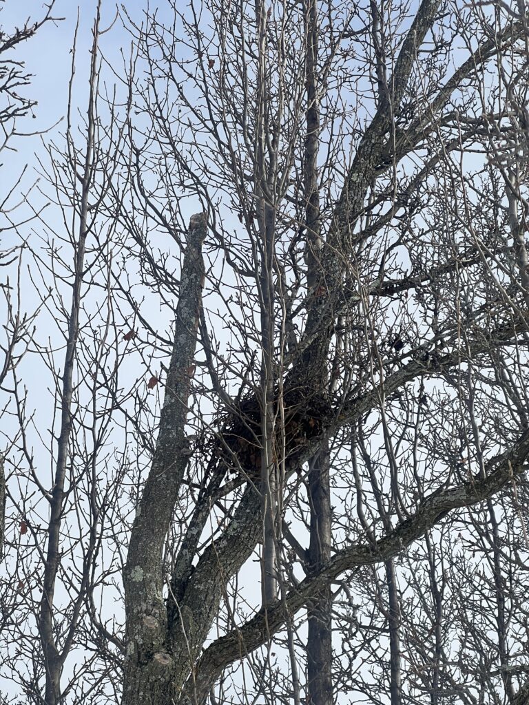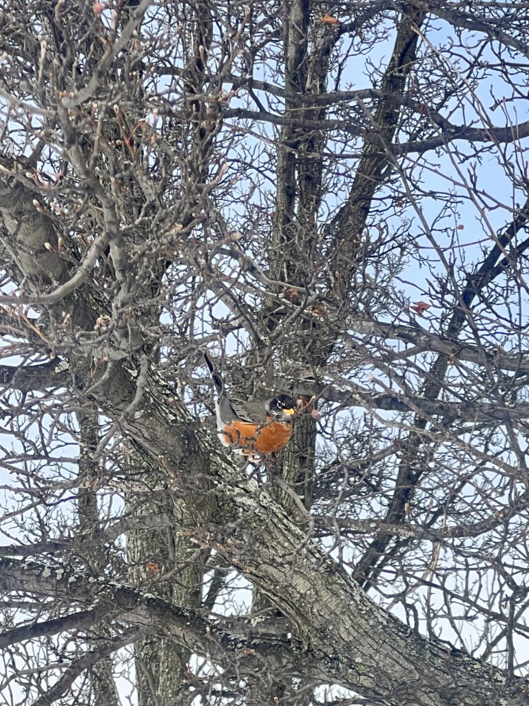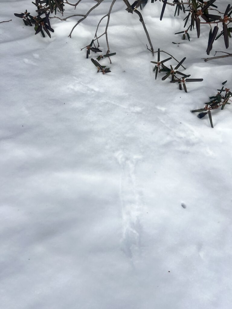 We saw many American Robins flying around and eating berries off of trees (unsure what type) on the waterfront. The robins were easy to identify by their orange and grey feathers, and we also took the time to observe their tracks in the snow. They had a hopping gait that had about 4 inches between each set of tracks. Walking along the bike path we also heard cardinals (we confirmed it with the Merlin Bird ID app) and saw one flying which was easy to spot due to the bright red color. We also did see a squirrel next but no squirrel tracks in the snow around it. I thought it was a bird nest at first, but it is most likely a squirrel’s because they tend to use more leaves whereas it is more rare for birds to use leaves in their nests, especially robins.