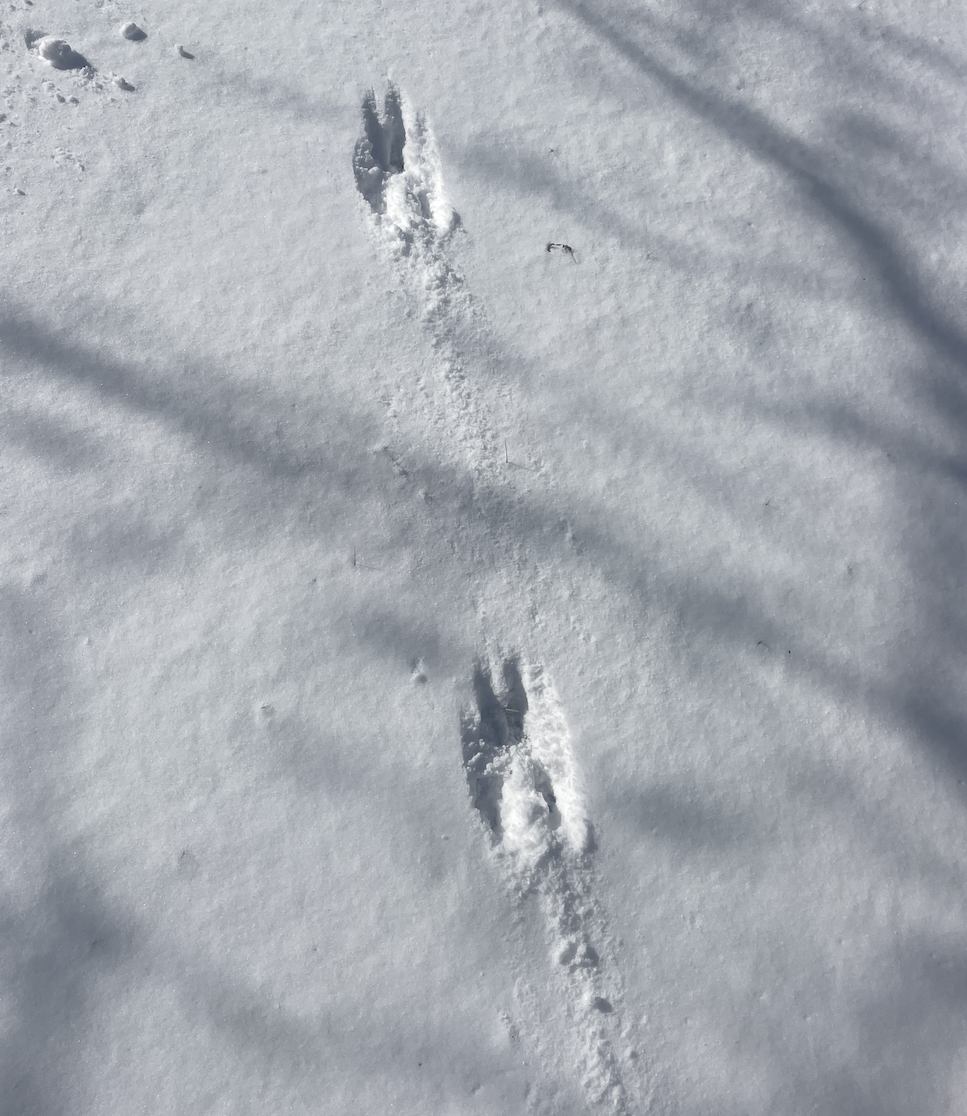When trying to identify these tracks, we used the tracking book in order to measure the stride and size of the tracks. We were pretty certain that it was some sort of a rabbit but followed the trail of the tracks just to make sure it hadn’t climbed up a tree, indicating that it would be a squirrel. Because the tracks stayed on the ground, and due to the sizing and the fact that we found the tracks at a relatively low elevation, we decided that it is a cottontail rabbit.
